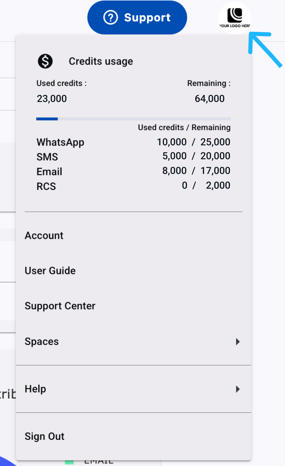 The Account Configuration section provides the necessary tools to the user to consult the user’s account Profile, documentation, support, and log out of the digital engagement platform.