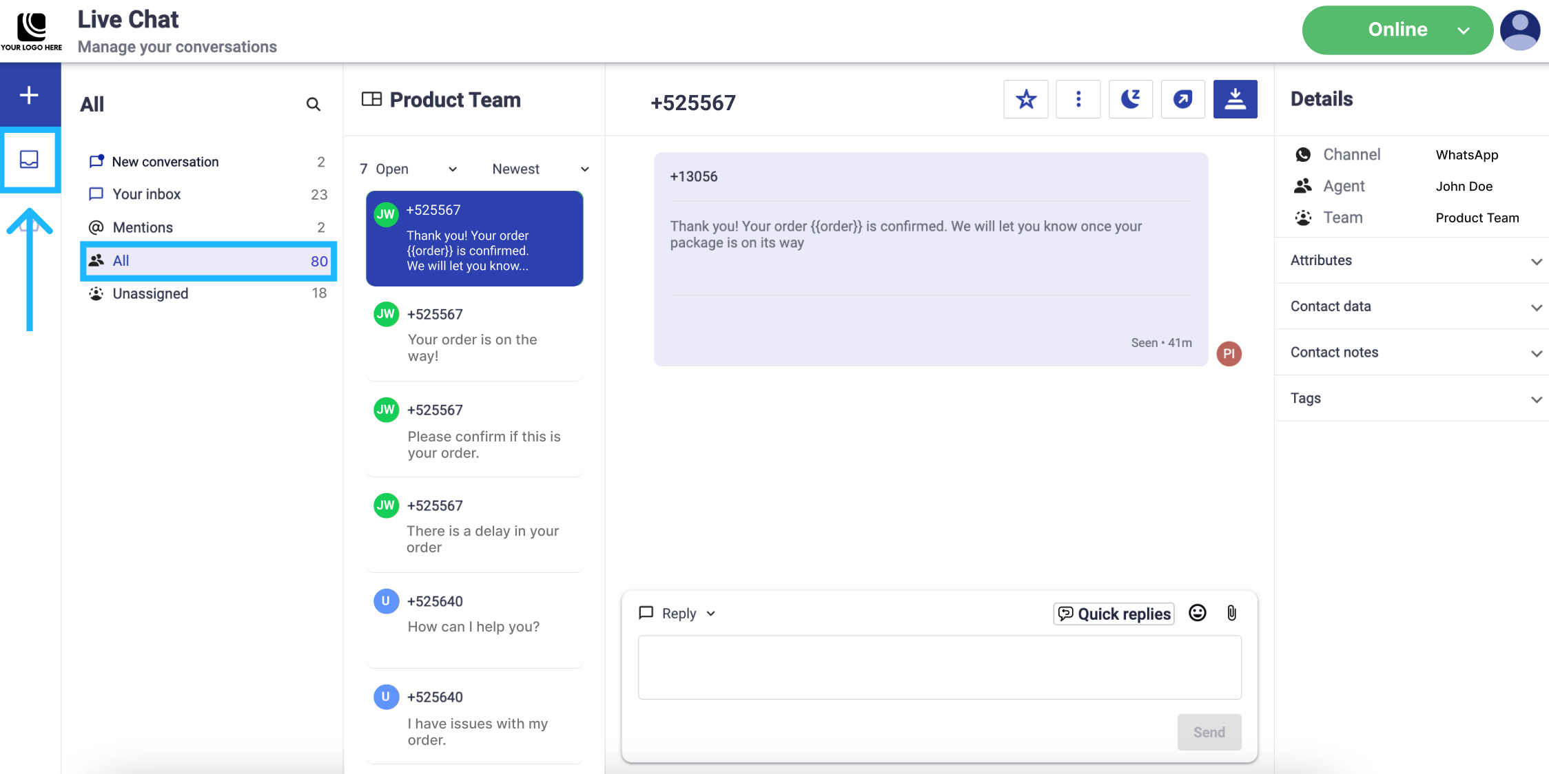 This section provides a consolidated view of all the conversations within your workspace. In this space, all conversations that are assigned, unassigned, open, or closed are displayed.