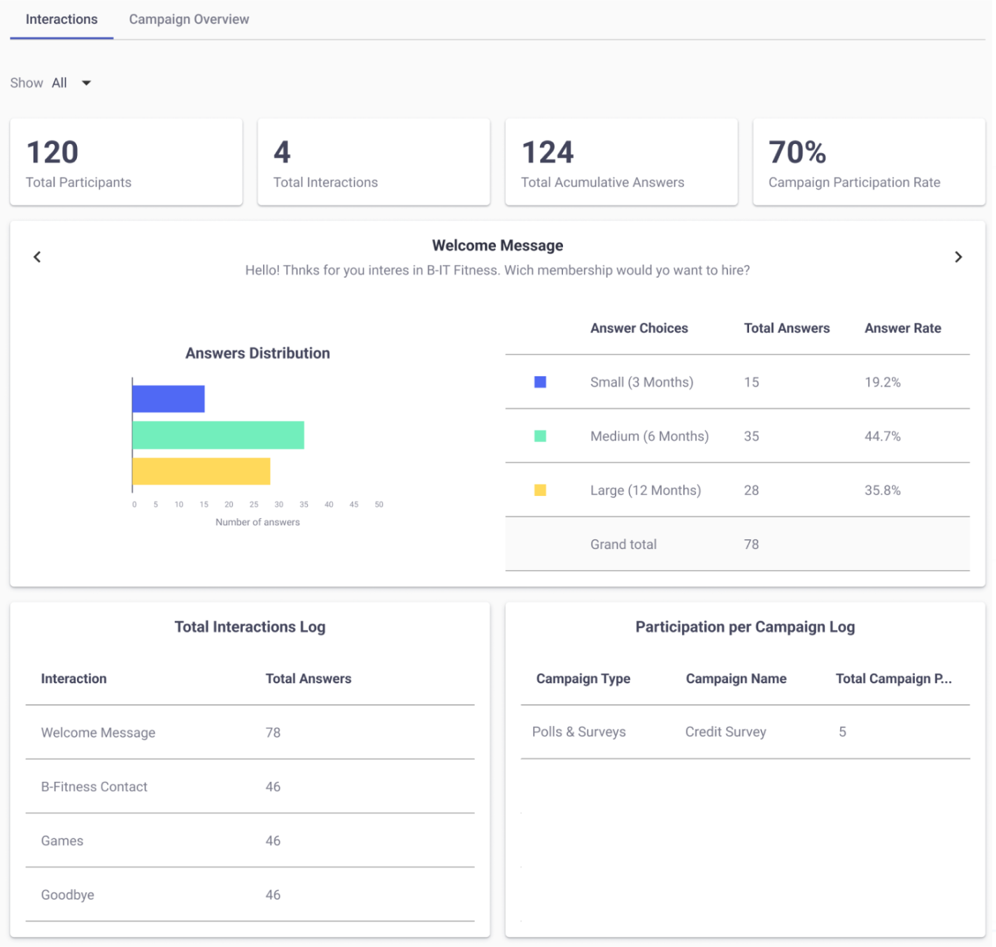 Total Interactions: Total number of interactions that have been created. For example, if the customer configured 4 interactions, but only the end users have interacted with 3 interactions, the 4 interactions configured in the campaign will be displayed in the KPI.