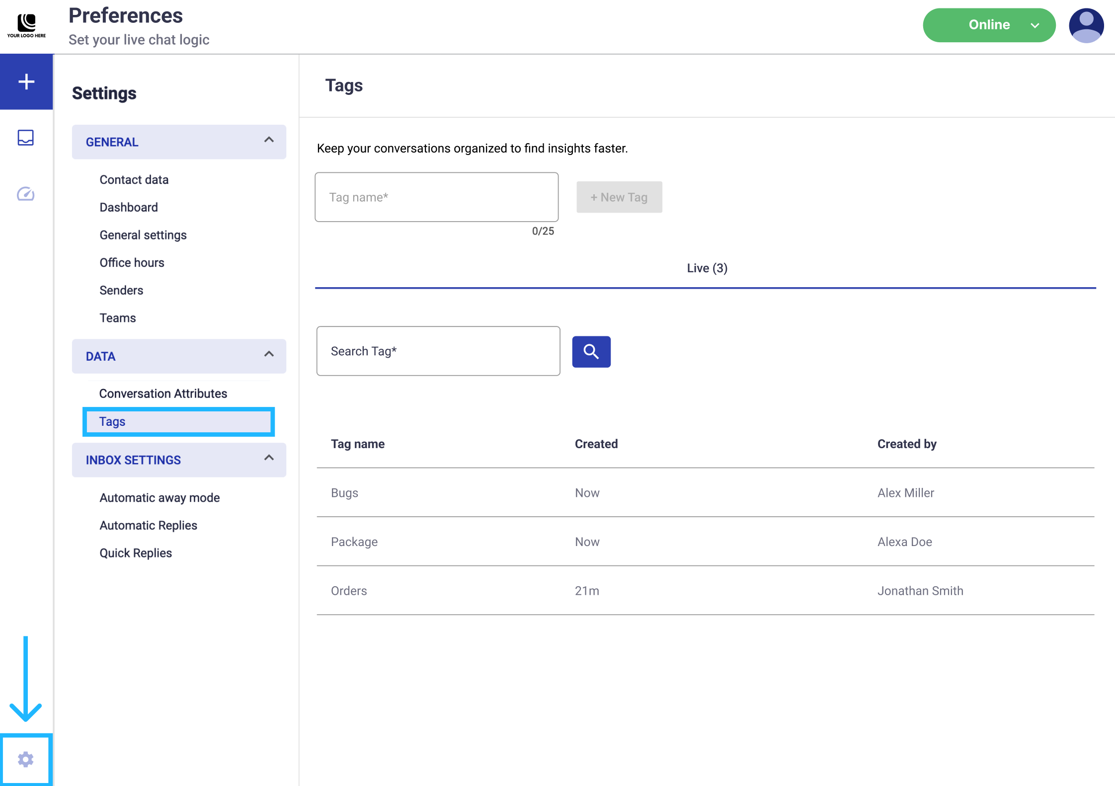 Tags are labels used to organize Live Chat conversations, allowing the agents or teams to quickly identify the topic or purpose of each interaction and analyze trends across support requests.