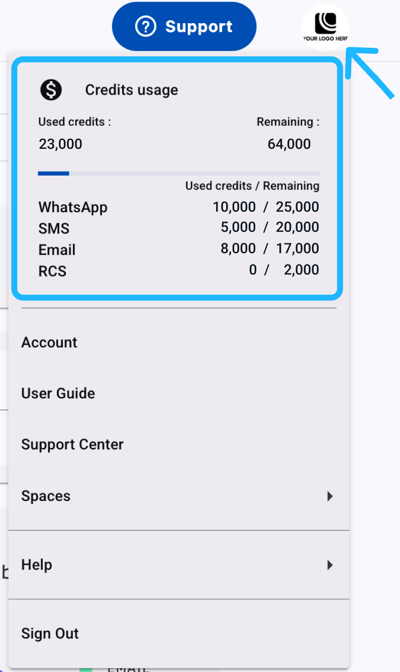 The Credits Usage panel provides a quick overview of the total credits consumed and remaining within the space, offering users immediate visibility into their credit balance across the delivery channels.