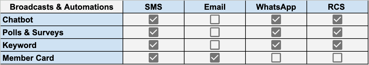 The SMS broadcast is available for: _Polls & Surveys, Keyword, and Chatbot automations.
