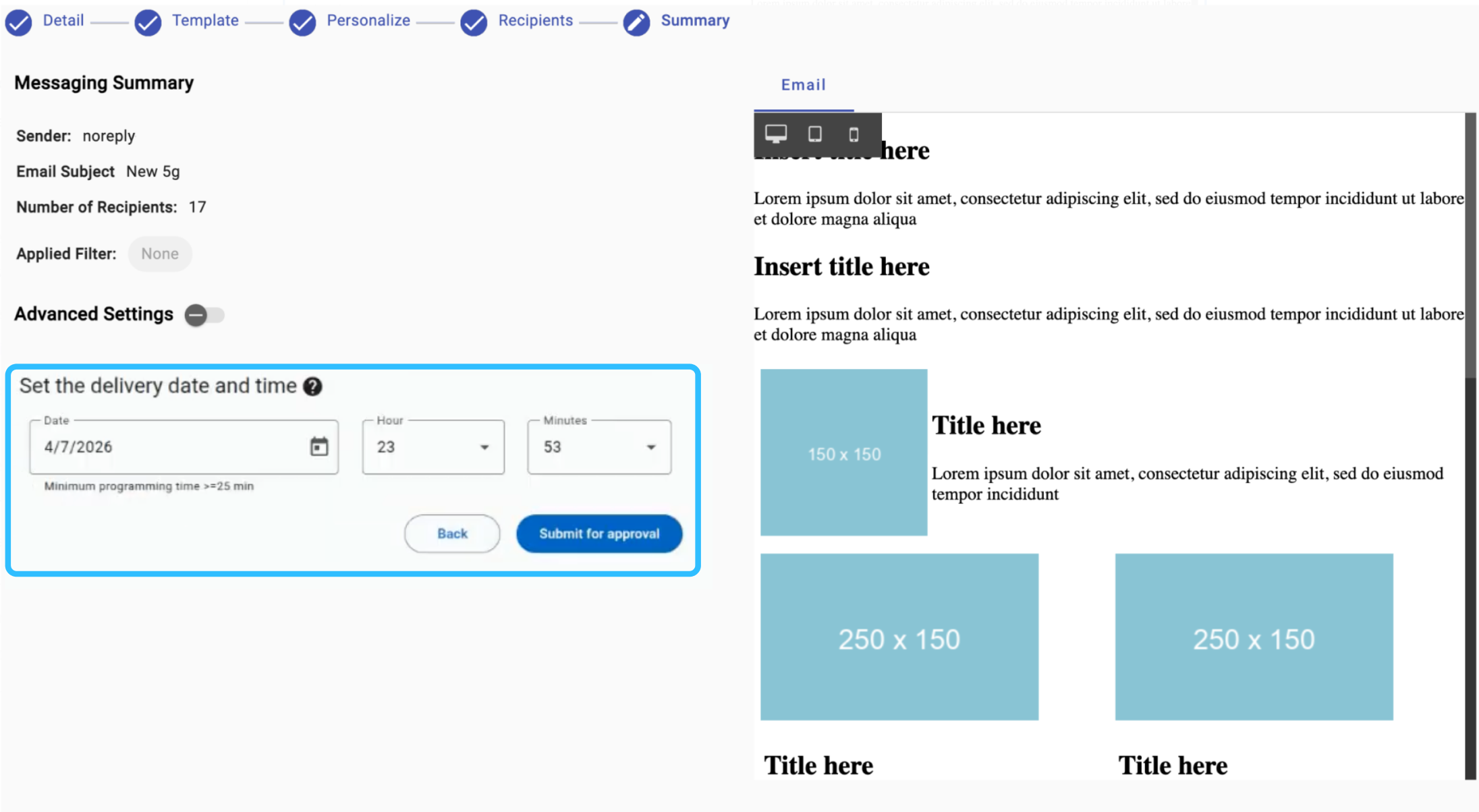 At this stage, once the delivery timetable is defined, the broadcast can be submitted by selecting the Submit for approval button. This action does not immediately send the message. Instead, the broadcast is submitted for review and transitions to For Approval status.