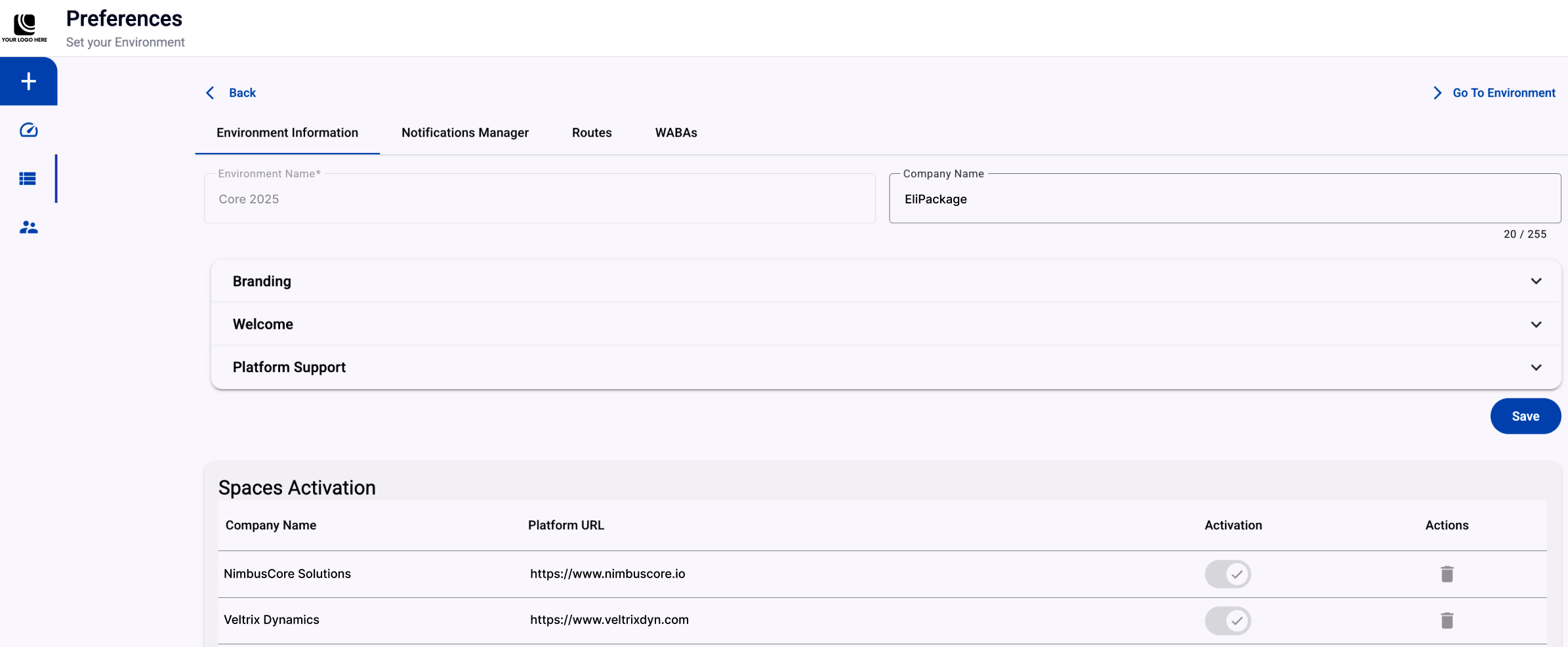 As a note, the company name, branding images (favicon, logo, icon), welcome image (logo), and platform support URLs (user guide, support center, API documentation) can be edited, except for the environment name.