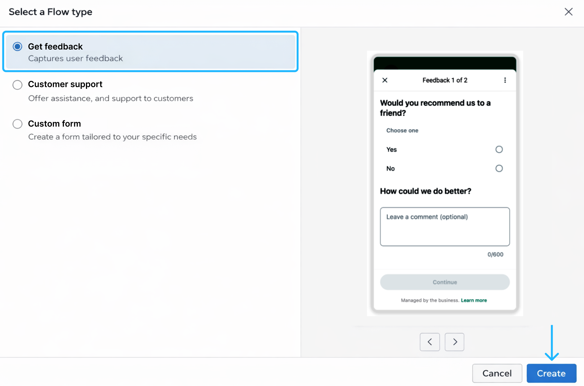 Then, for this customer feedback use case, select Get feedback. This option is specifically designed for collecting structured feedback from users and automatically provides a form-oriented Flow structure optimized for survey-style interactions.
