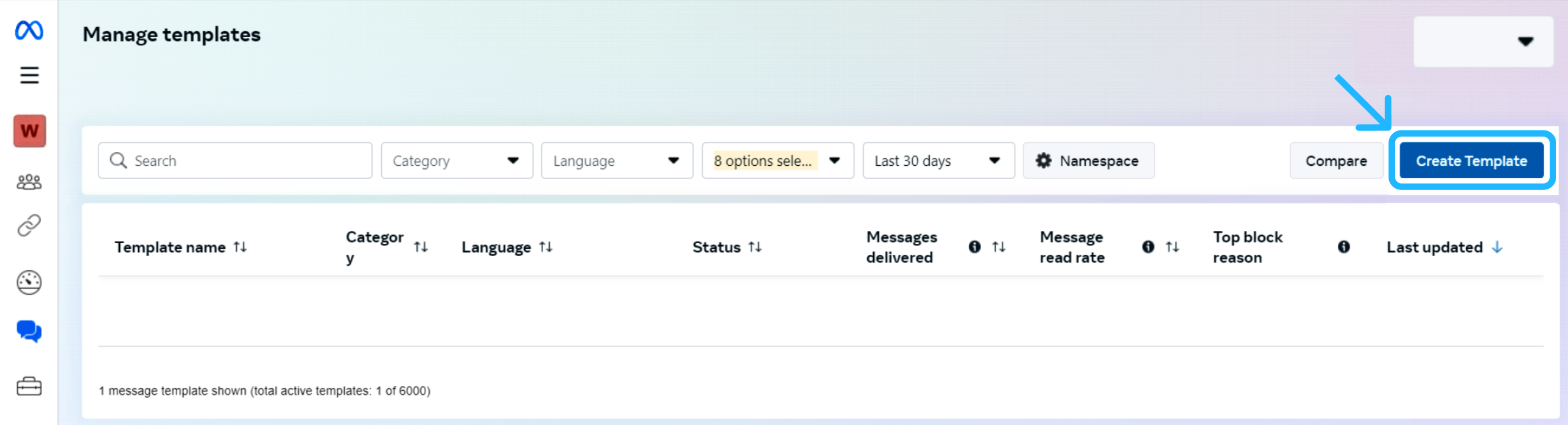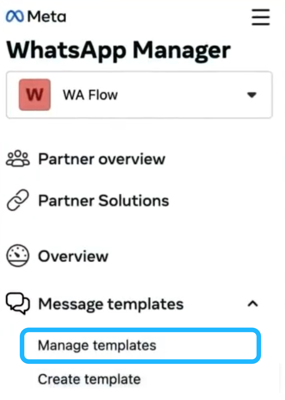 From the Meta Business Manager, click the Message templates option located in the left sidebar. This will open the WhatsApp Manager module. Then select the Manage templates section, where all existing templates are listed, and new templates can be created.