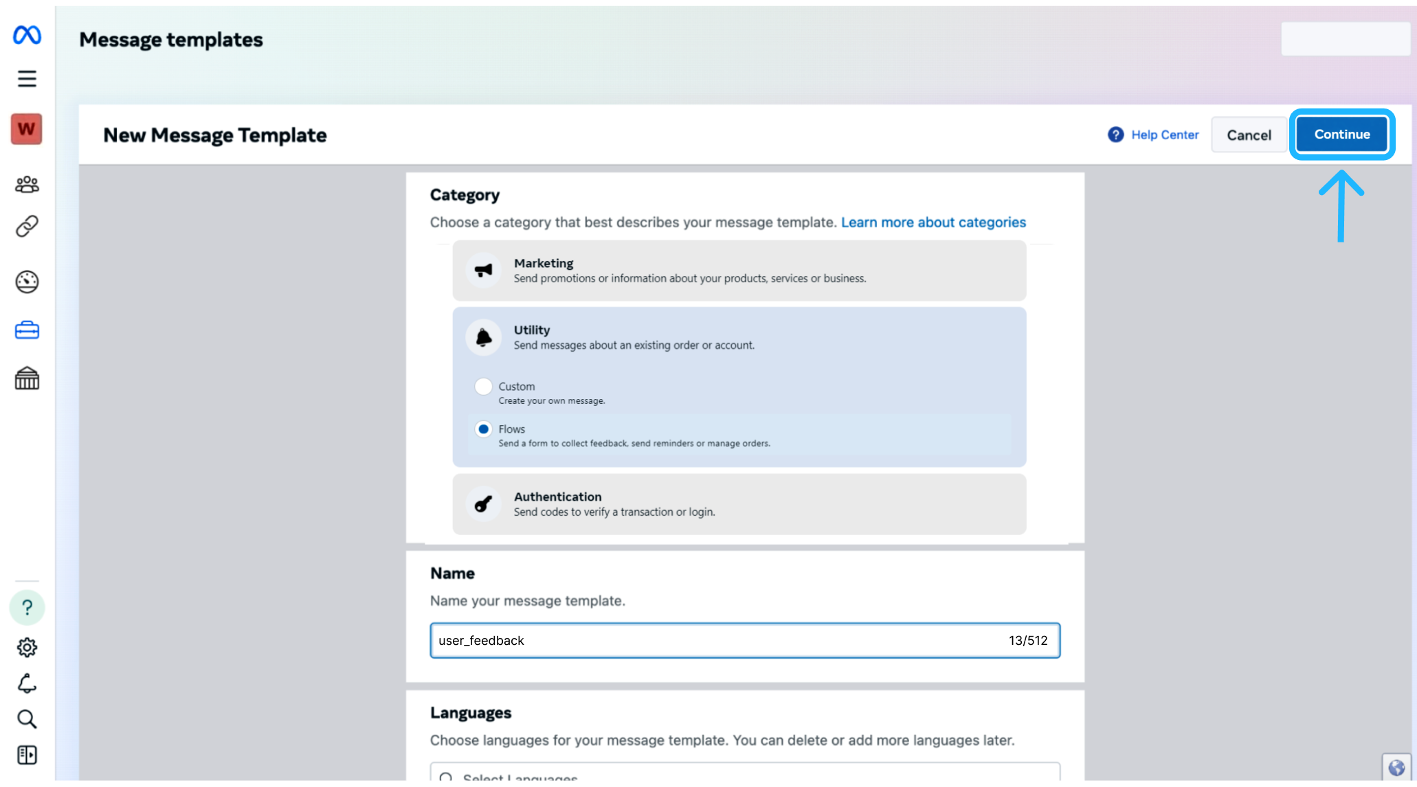 Category: Select the category that best matches the purpose of the message. For this use case, choose Utility, as the message relates to a specific interaction with users following an event — for example, Form. And click Flows.