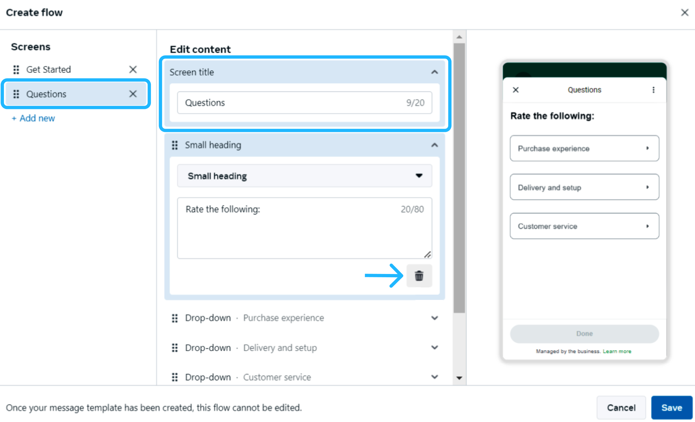 Questions, making it clear that this is where the user will start answering the flow’s prompts. Then, delete any pre-built questions in the second screen.