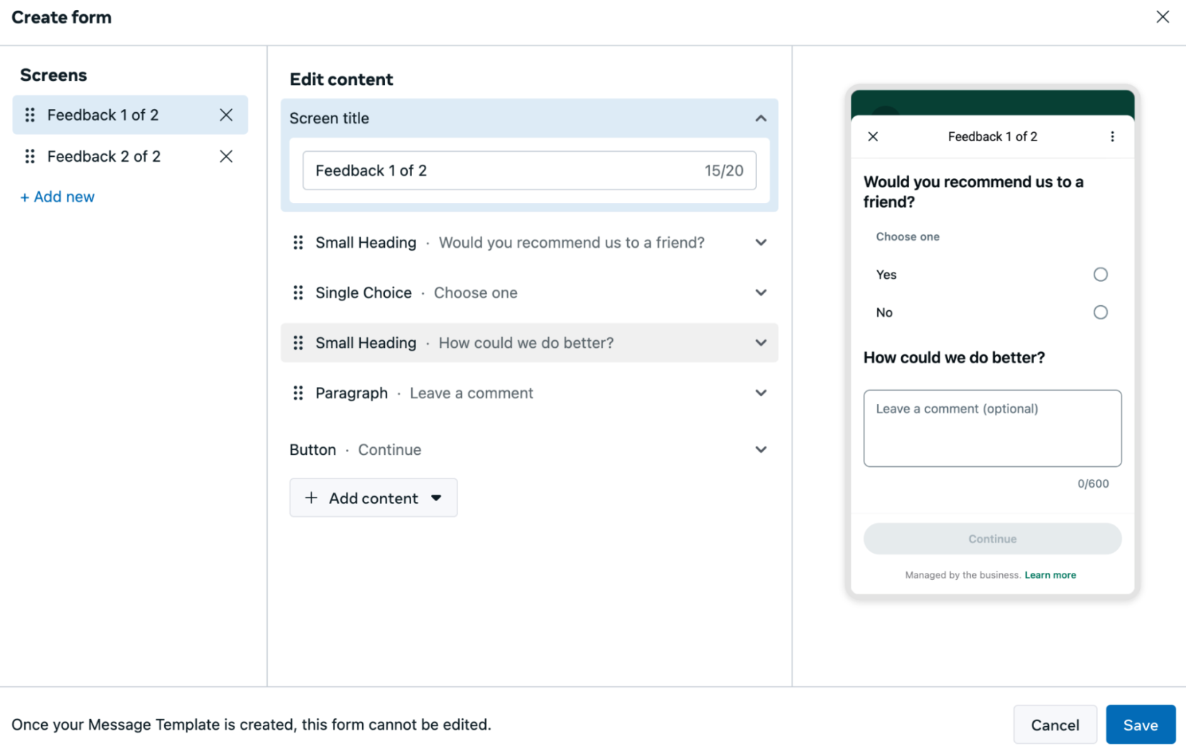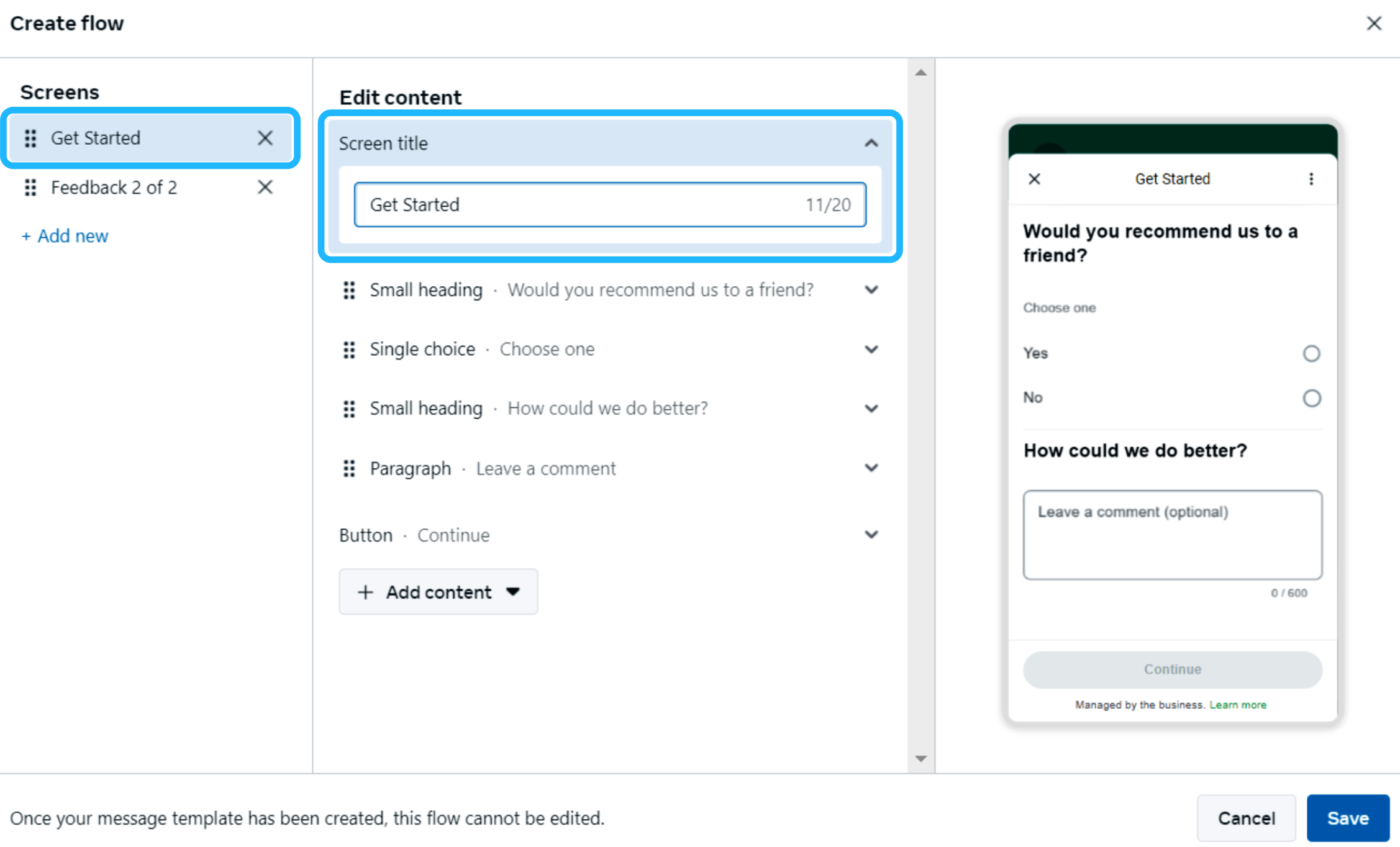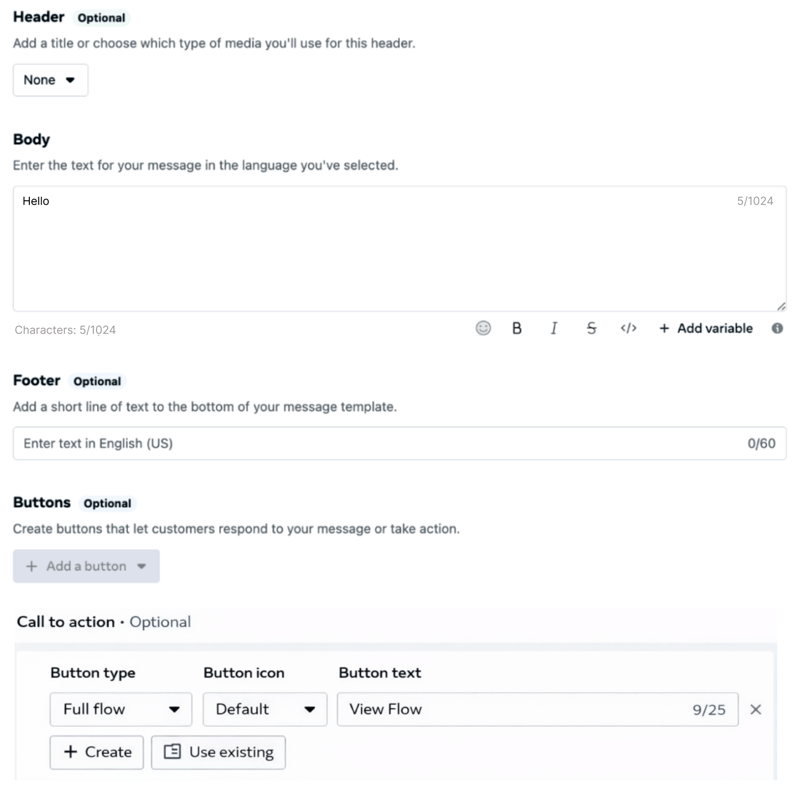No Header or Footer is included in this example. Although both components are supported when sending a Flow through a message template, they are optional and not required for this scenario.