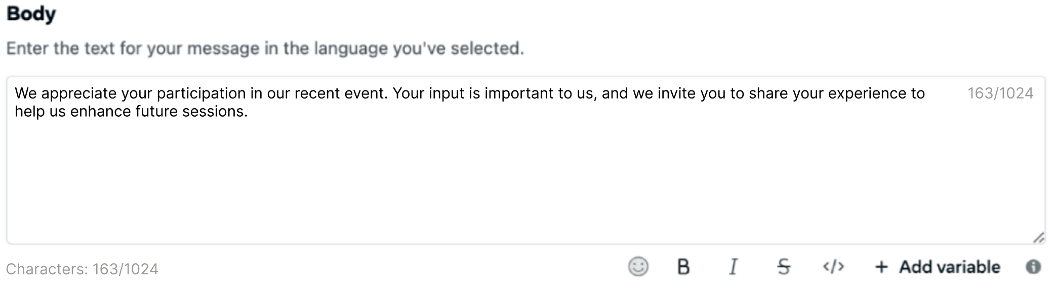 The Body contains the main message shown to the user and provides the necessary context before the Flow is launched. In this use case, the body thanks the event attendees for their participation and explains why their feedback is being requested. For example, you can enter a message such as: We appreciate your participation in our recent event. Your input is important to us, and we invite you to share your experience to help us enhance future sessions..