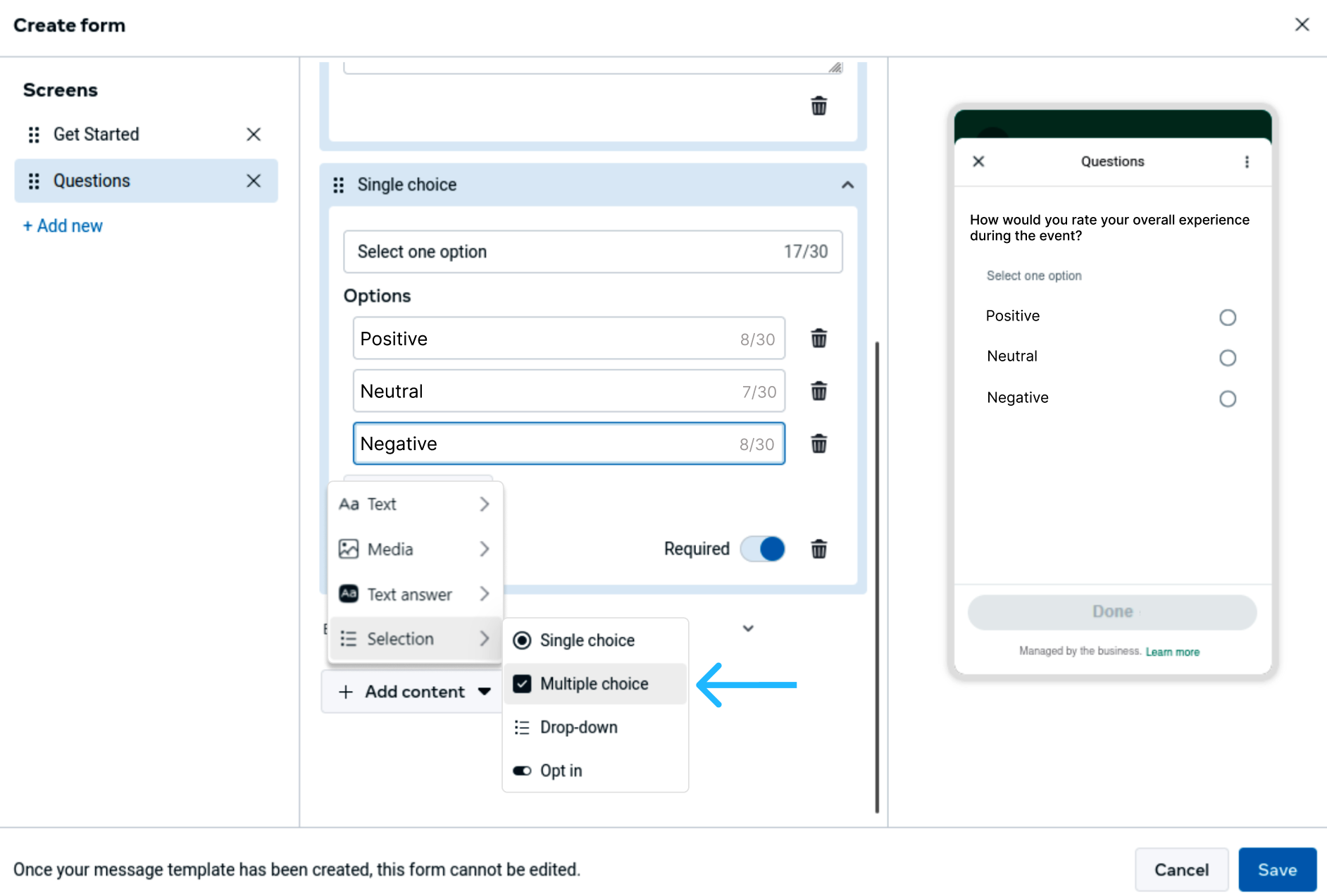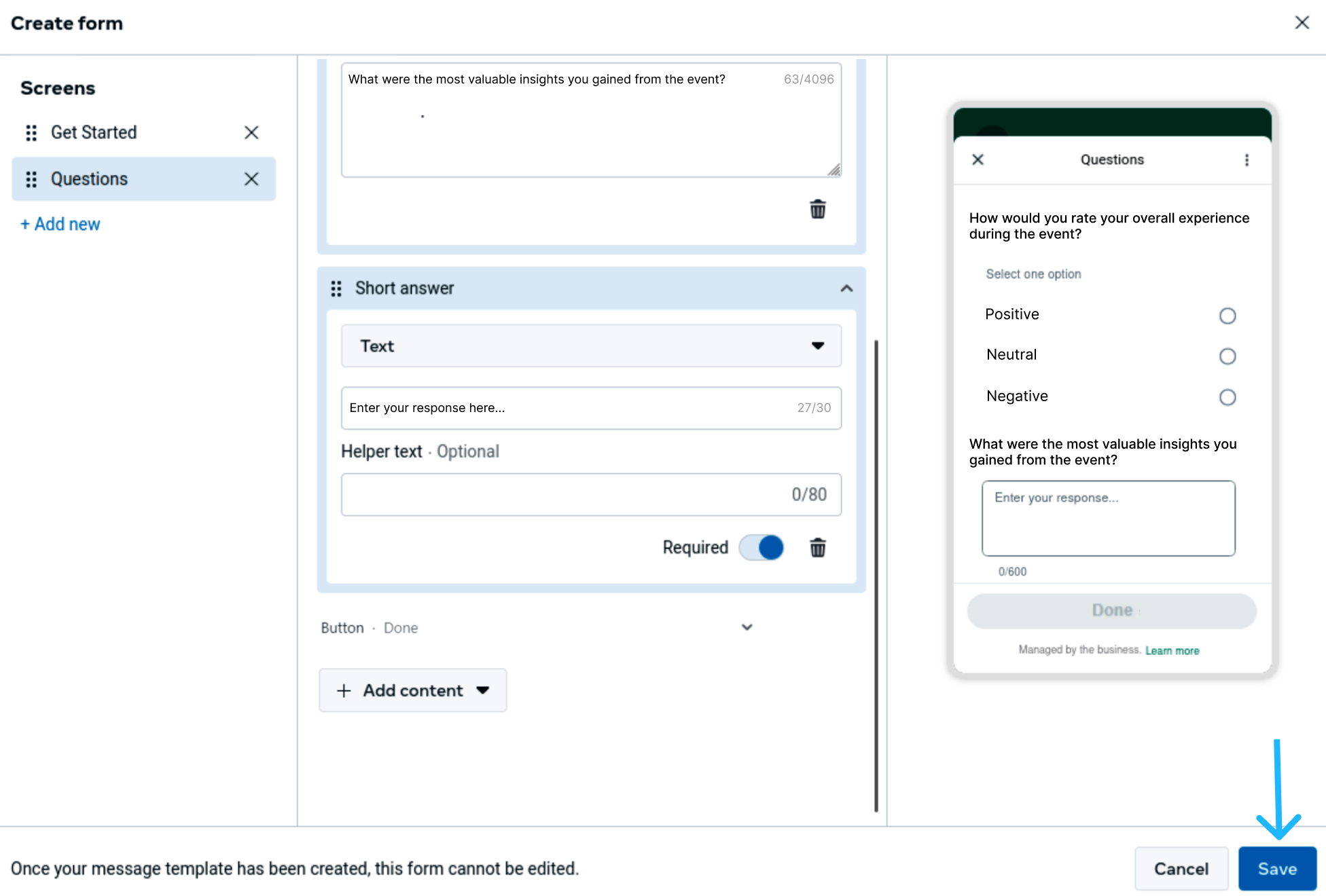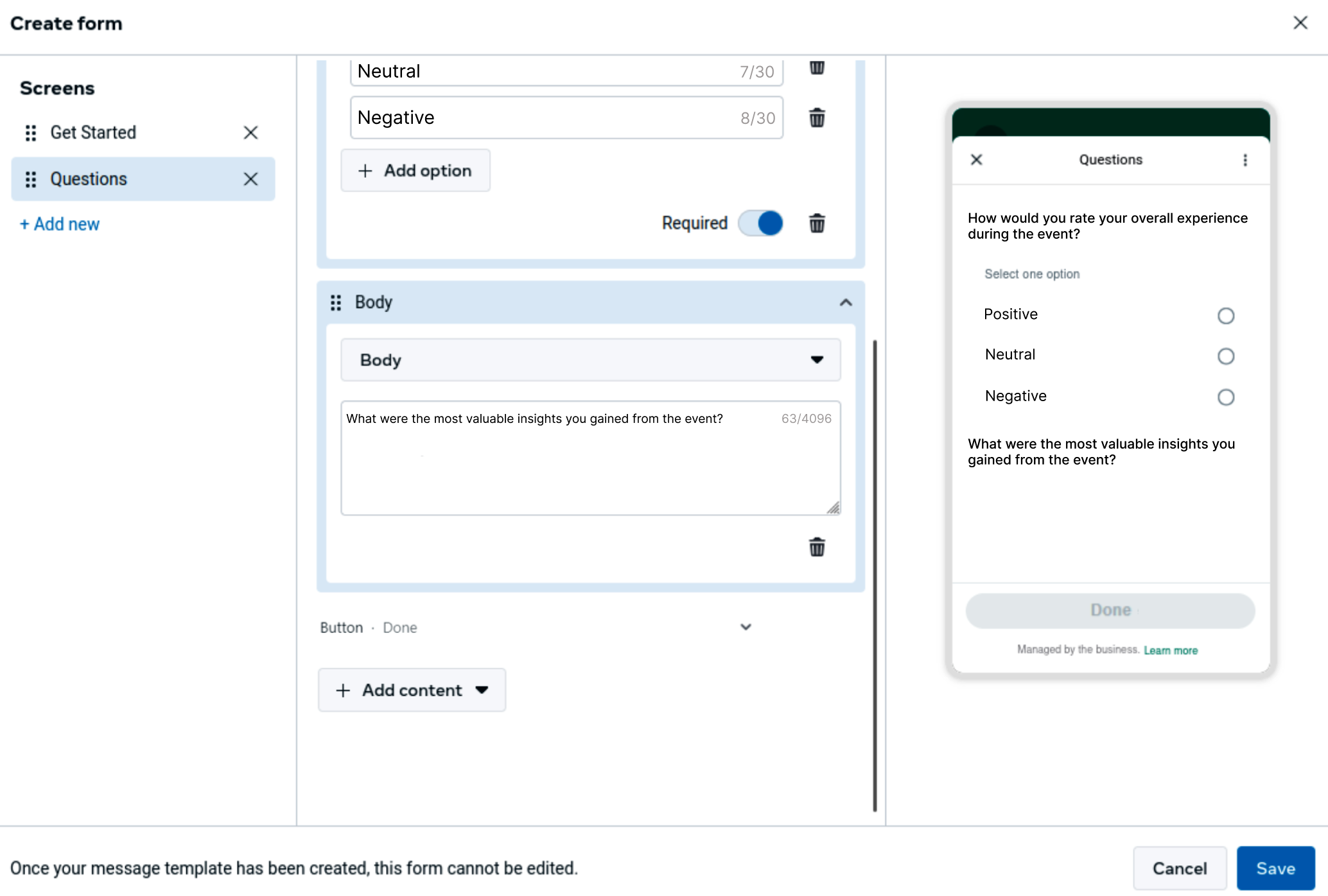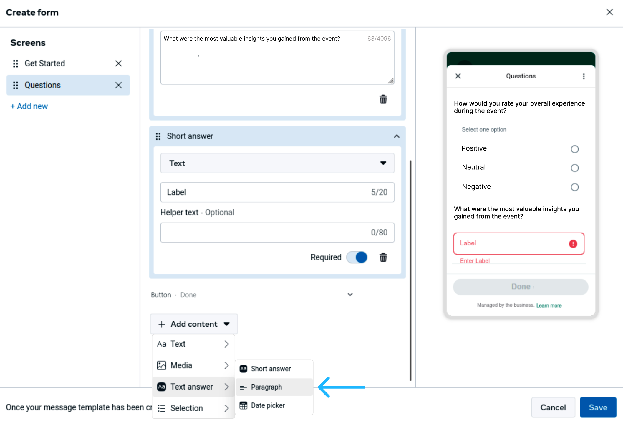 On the second screen, start adding the questions that will collect participant feedback, including multiple-choice or open-ended text responses. For example: