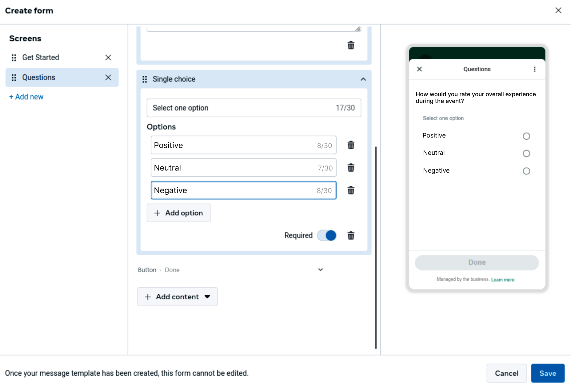 “Select one option”and add the predefined options that best represent the possible responses, for example:Positive,Neutral, andNegative. You may also mark the question as required to ensure the user provides an answer before continuing.