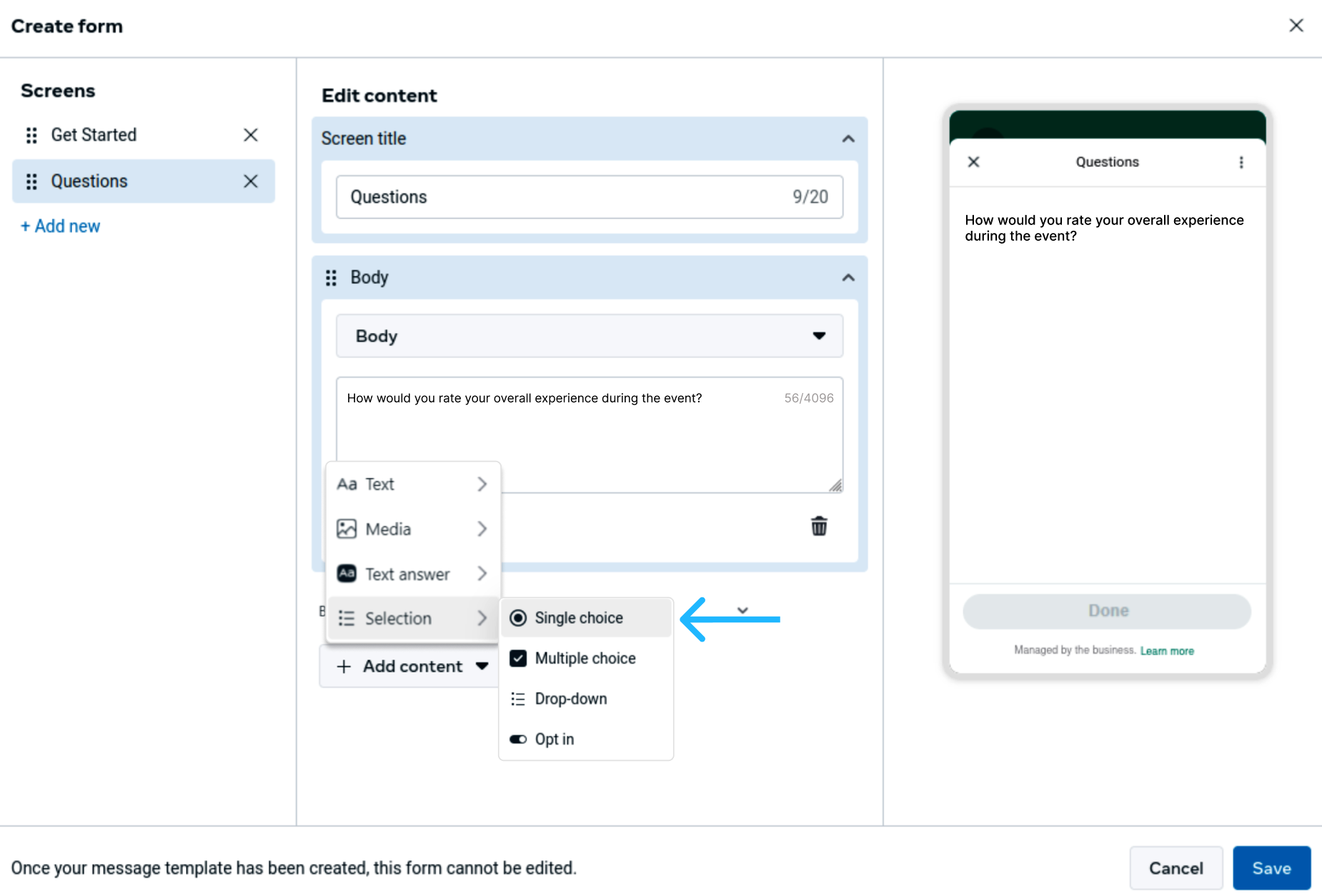 This same process can be followed to add additional choice-based questions. Depending on the scenario, you may use single-choice components for exclusive selections or multiple-choice components when more than one answer is allowed. If you want to add multiple-choice questions, ensure you choose Multiple choice under Selection.
