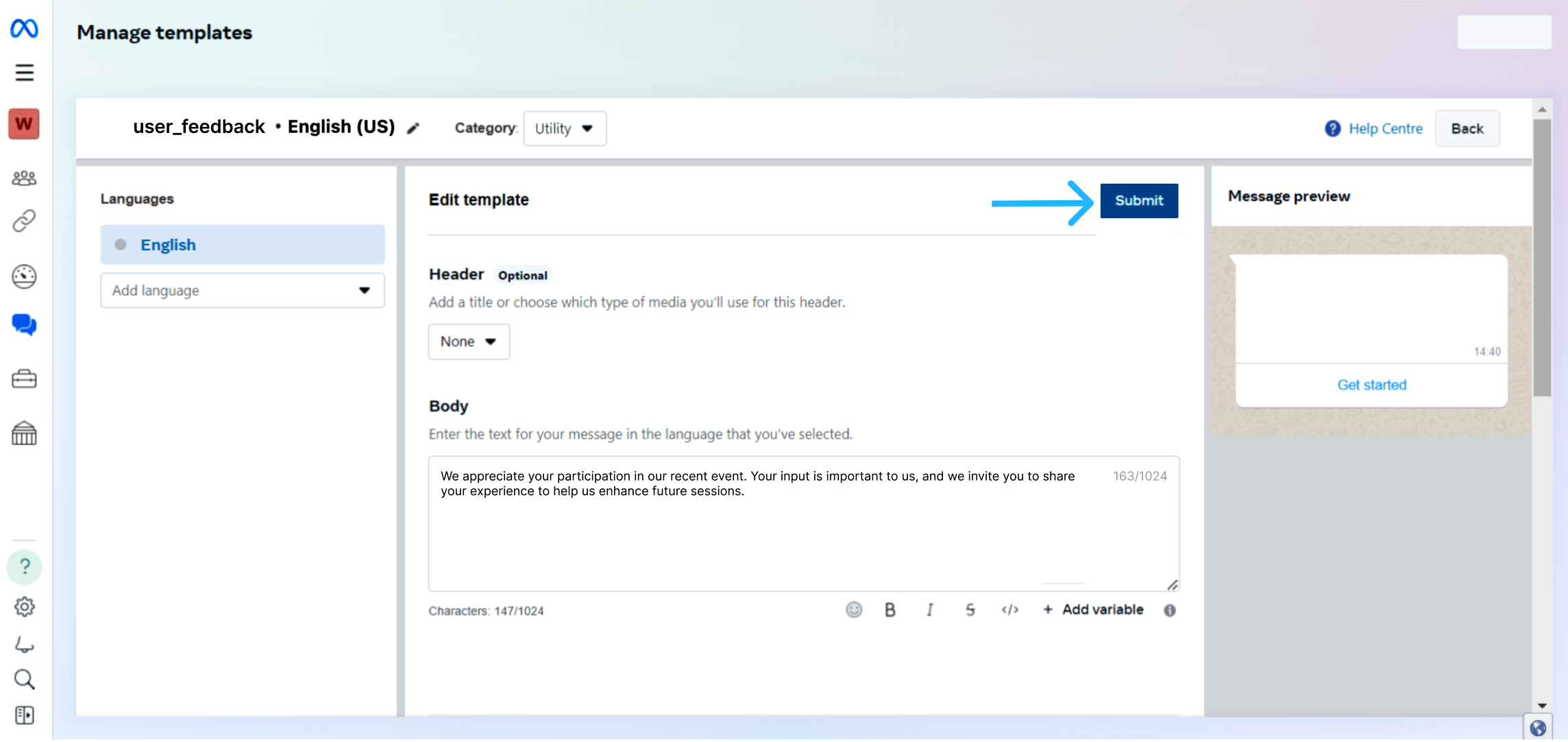 Once you are in the Message Templates section, you can proceed to create a new template and associate it with a WhatsApp Flow.