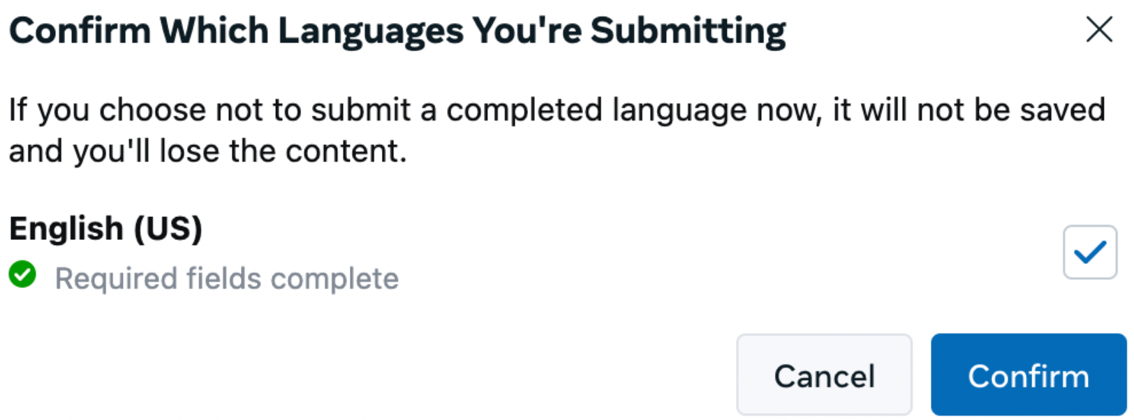 If a language is not selected or confirmed at this stage, its content will not be saved, and any unsaved changes for that language will be discarded.