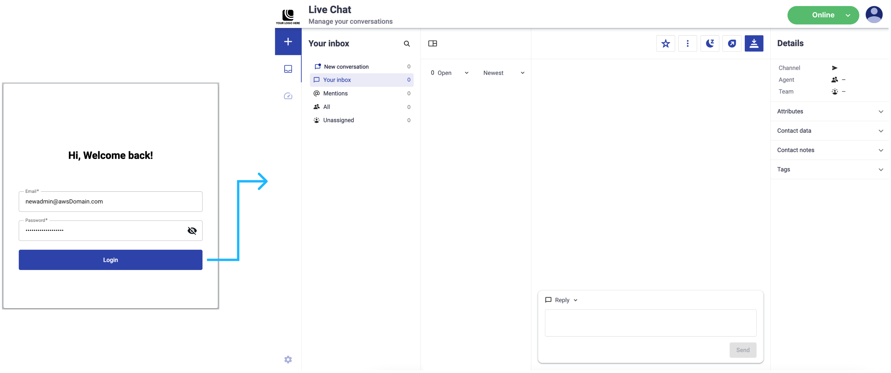 - The admin can use the same credentials (email and password) of the space to log in to the Live Chat.