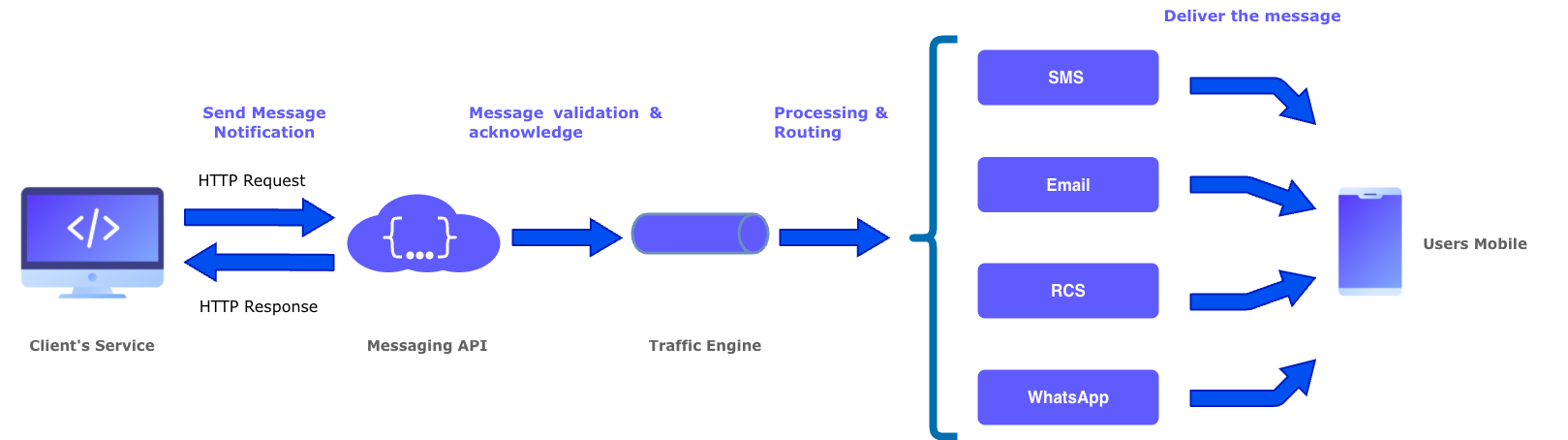 Messaging API is a messaging service that allows you to send a New Notification Message to a specific delivery channel. This API unifies delivery channels (SMS, Email, RCS, WhatsApp) to send the desired notification message through a single method.