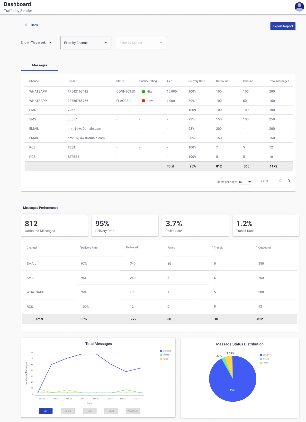 This section enables you to analyze the traffic between each sender alongside its respective delivery channel (SMS, Email, Push notifications, WhatsApp, RCS).