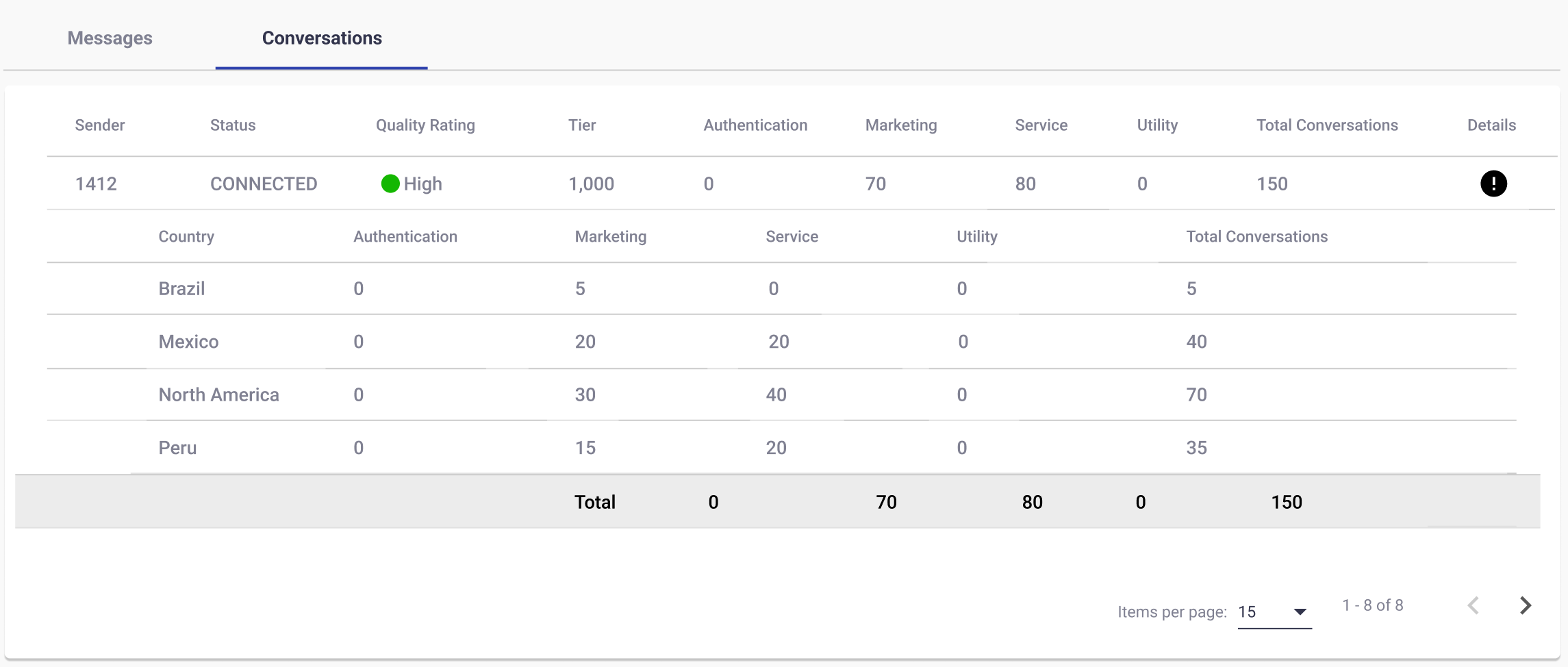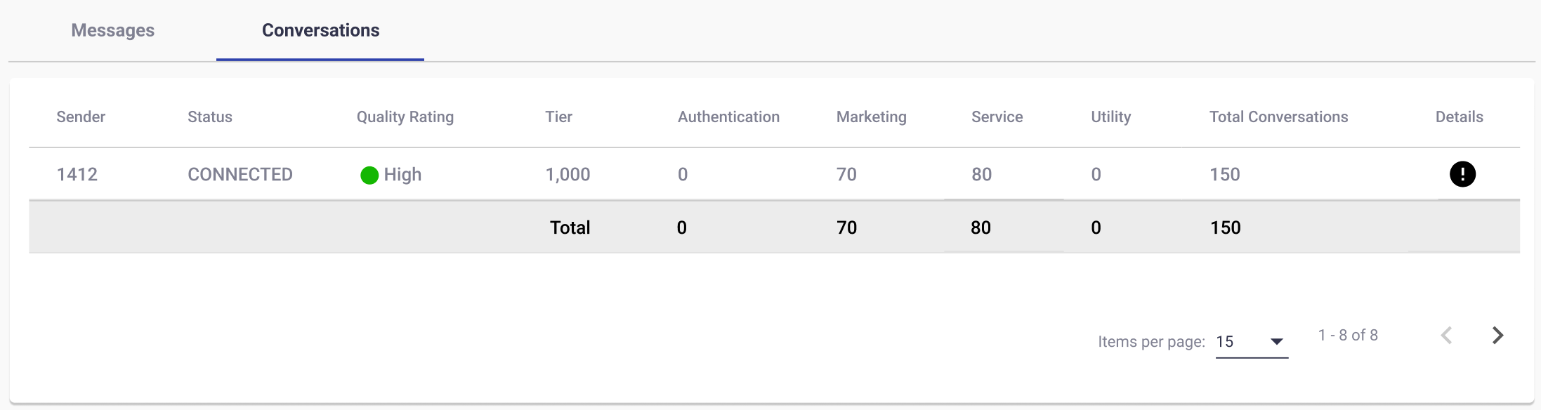 Tier | Displays the messaging tier level assigned to the sender, which determines the maximum number of business-initiated conversations allowed per day. For example, a Tier value of 1,000 allows up to 1,000 customer-initiated conversations daily using approved templates. |