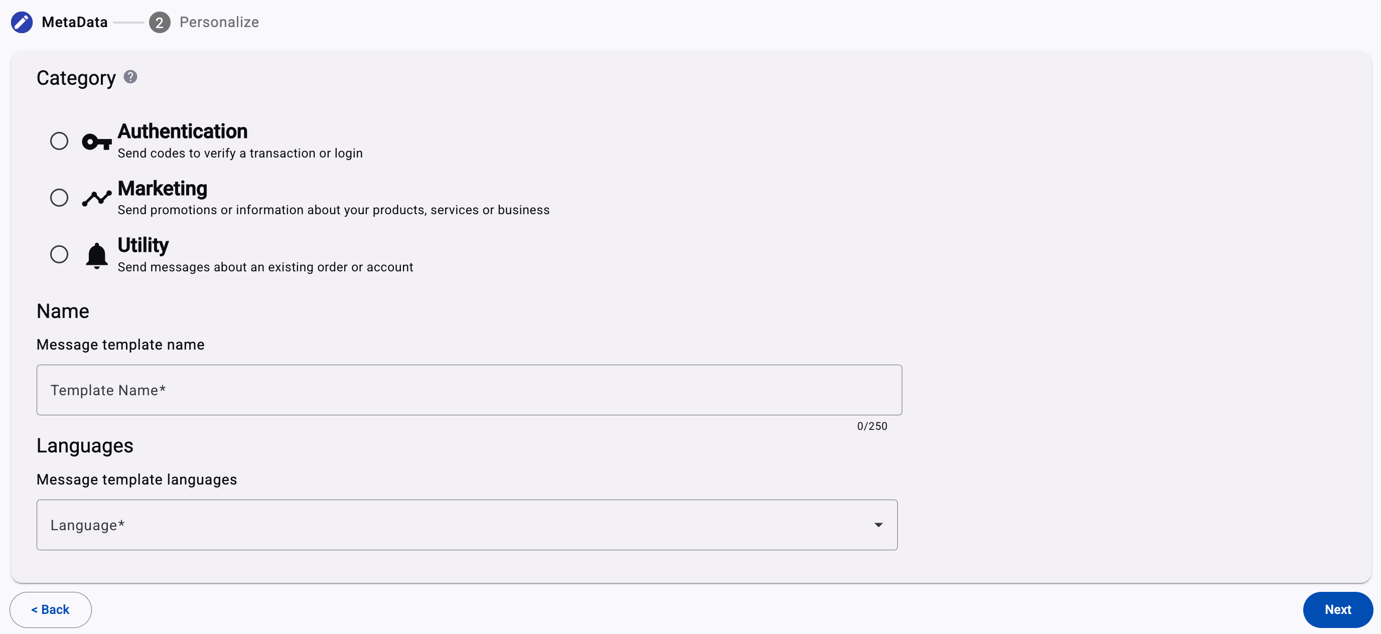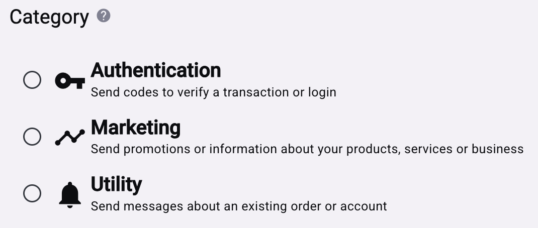 The categories are used to identify the purpose of the template in WhatsApp’s approval process. Be sure that the contents of the message template and the category you select are aligned and reflect the intended purpose.
