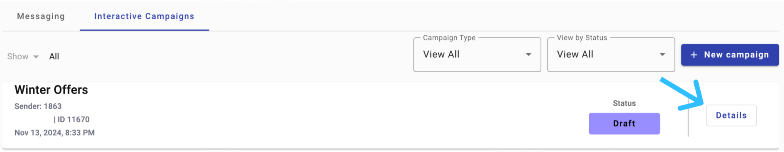 It is divided into two tabs, one for each group of broadcast and automation types, Messaging and Interactive Campaigns tabs. Each tab offers filters, the possibility to create new broadcasts and automations, and displays cards in the main section of the pane.