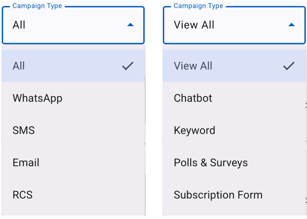 Campaign Type is a context-dependent filter that displays the types of broadcasts and automations associated with each tab.