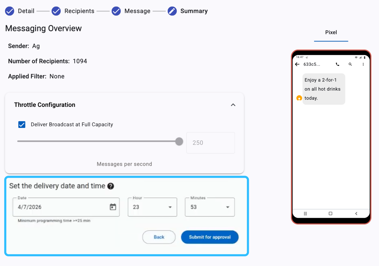 At this stage, once the delivery timetable is defined, the broadcast can be submitted by selecting the Submit for approval button. This action does not immediately send the message. Instead, the broadcast is submitted for review and transitions to For Approval status.