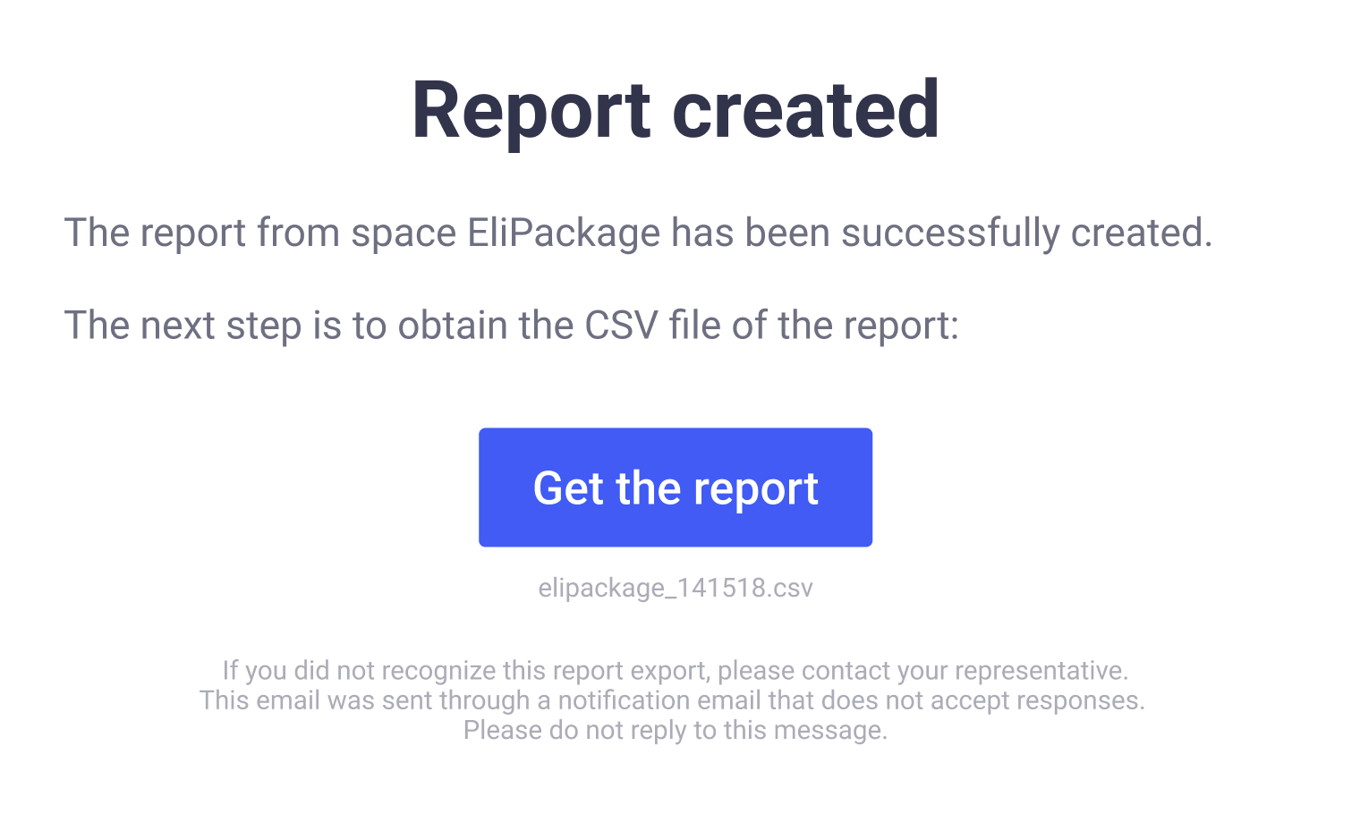 After the report has been generated, you will receive an email notification containing a download link. Open the email notification sent to your inbox, and click Get the report. The report will be downloaded as a CSV file, a widely supported format that can be opened and analyzed using spreadsheet applications such as Microsoft Excel, Google Sheets, or any other compatible data analysis tool.