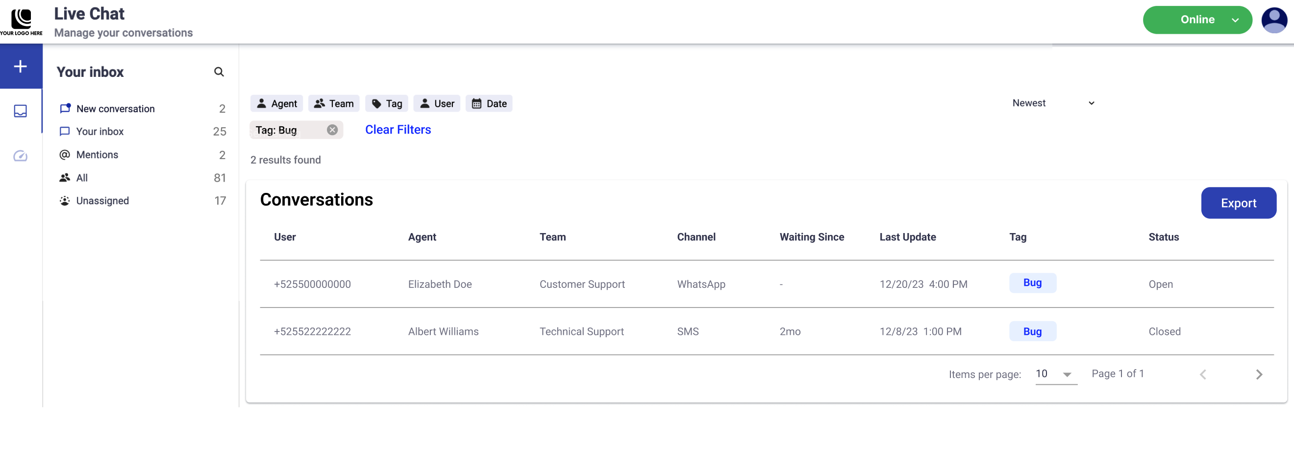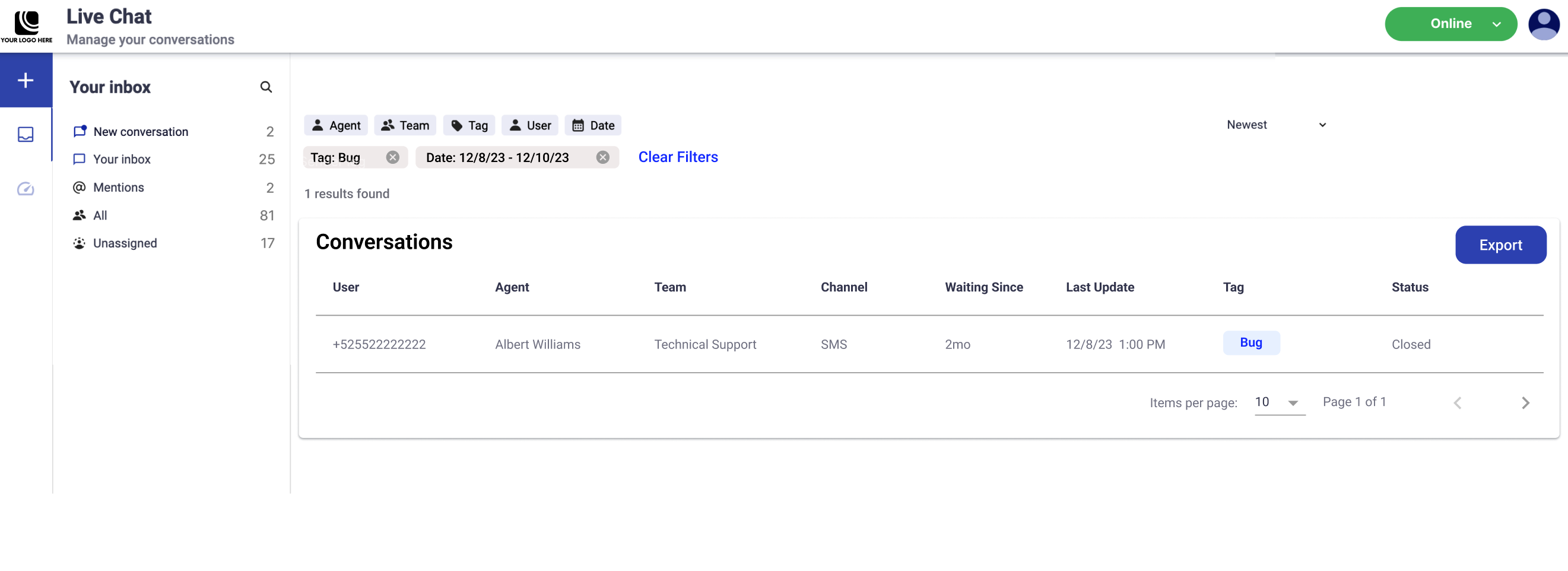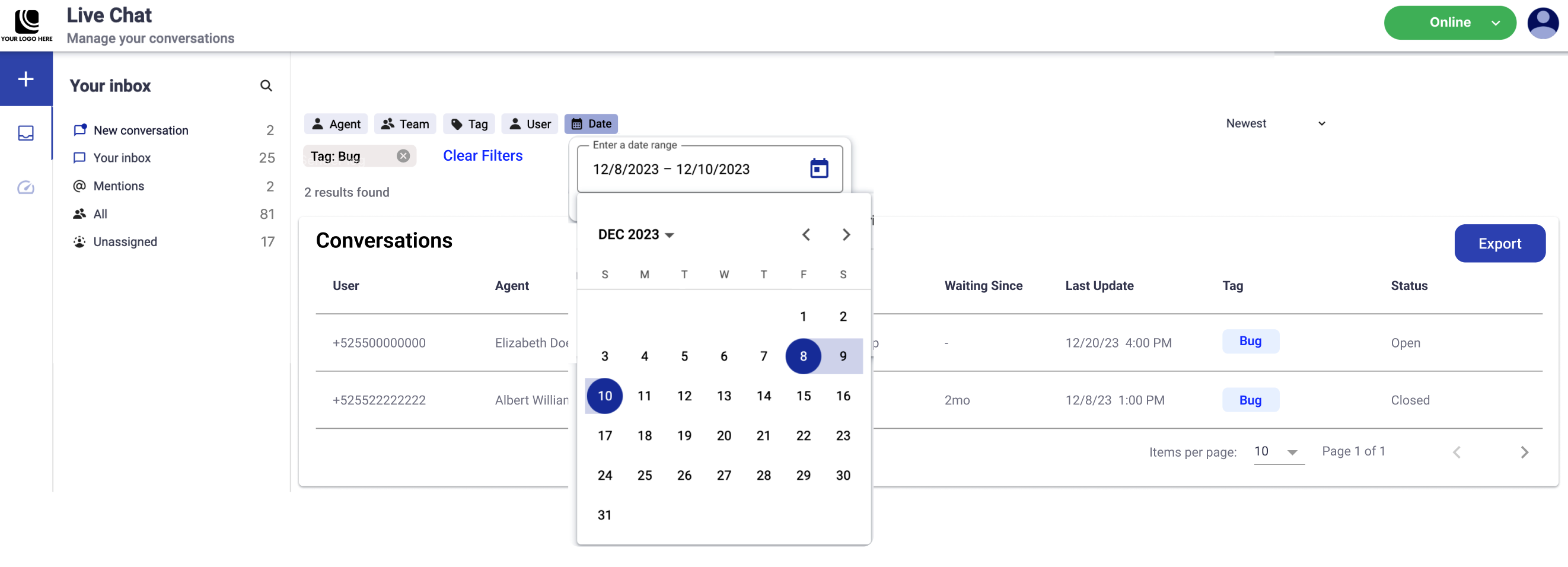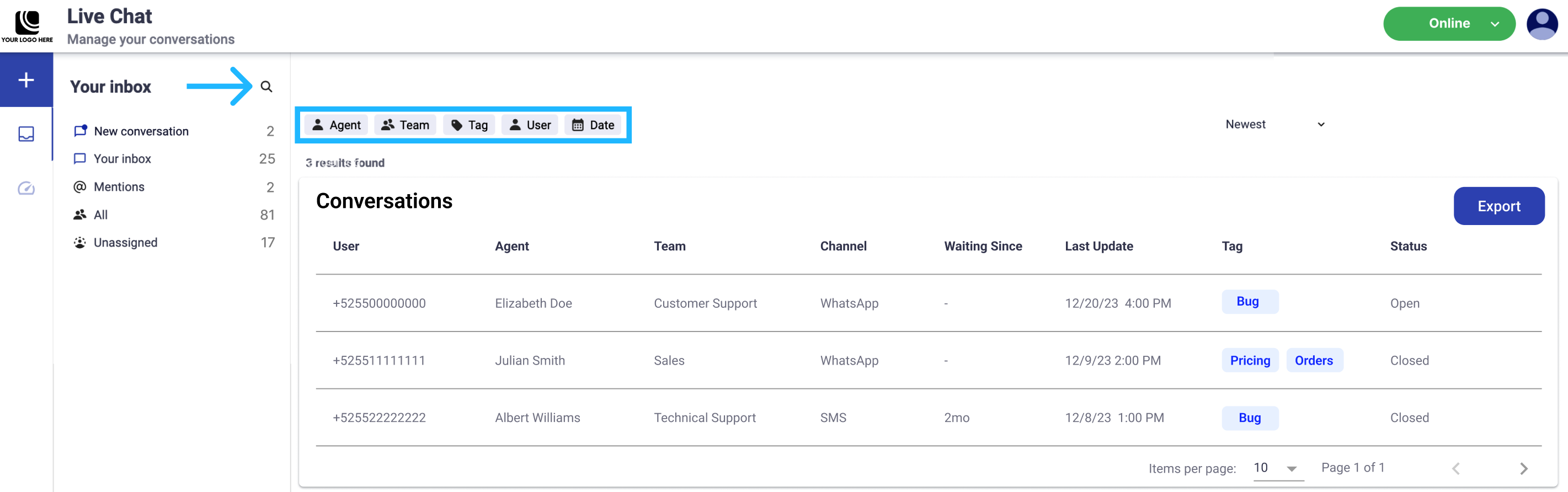 For more precise search results, use filters to narrow down your search criteria. For instance, you can filter by agents assigned to specific conversations during a defined date range or by conversations tagged. That is, you can even use just filters without needing to enter any keywords.