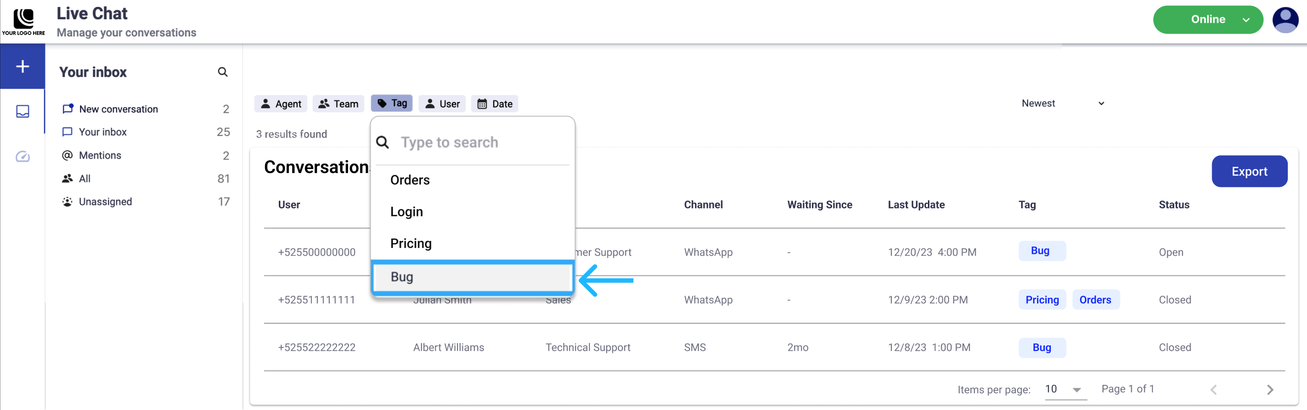 This search will display all conversations that include the tag name (Bug) and are associated with the selected tag.