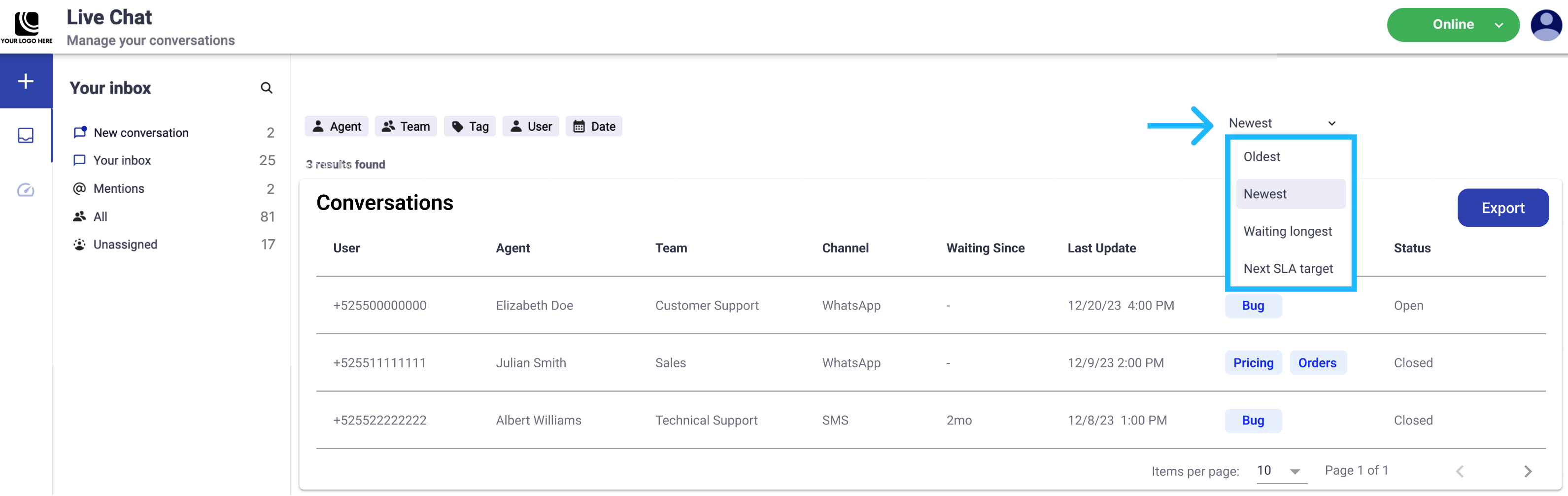 To view the oldest, waiting longest, next SLA target, or priority first at the top, use the dropdown located on the right of the filter options.