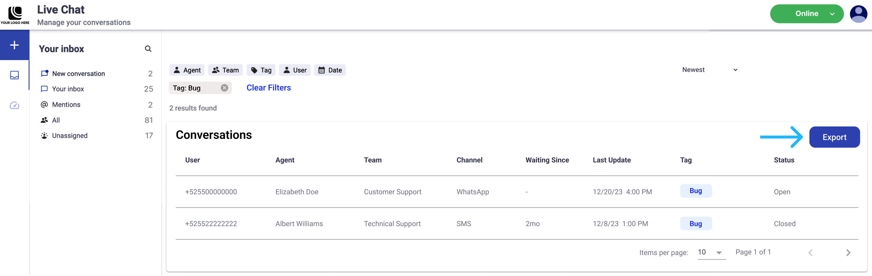 The Export feature allows administrators to download a report of the conversations displayed in the Conversations table. The exported report includes all conversations currently shown in the table and respects any applied filters. This means that if you filter conversations by Agent, Team, Tag, User, or Date, only the filtered results will be included in the exported report.