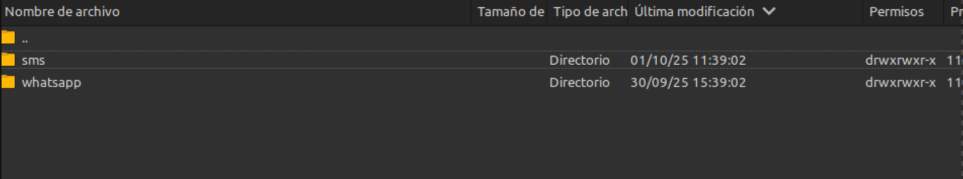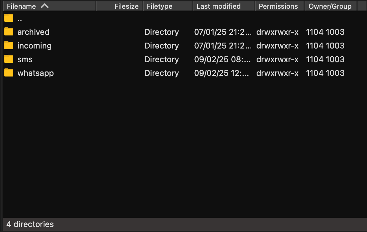 - When connecting to the SFTP server, only the folders sms and whatsapp will be visible.