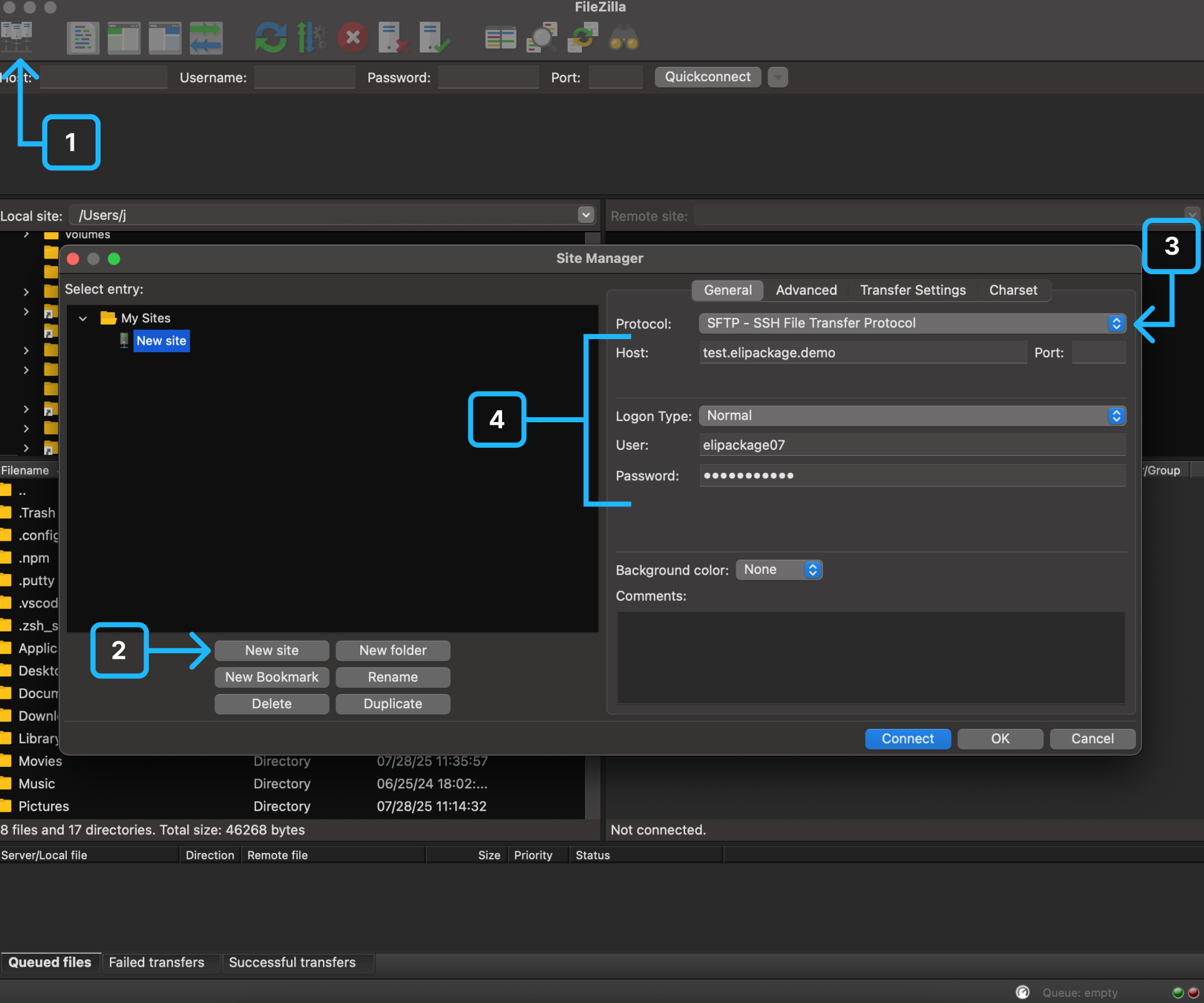 Once FileZilla Client is installed and launched (or your preferred SFTP client), follow these steps to configure the connection:
