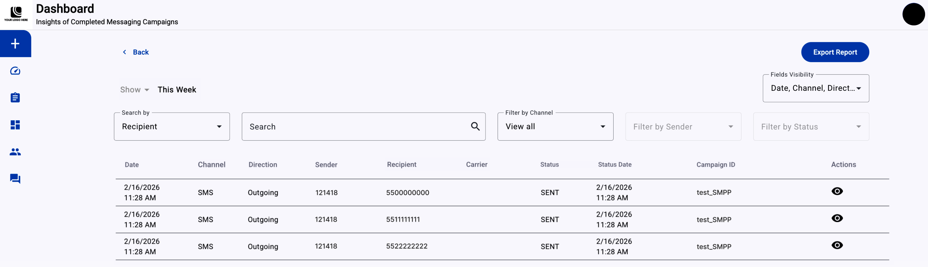 - Search By: Allows users to define the search criteria. You may search by Recipient (mobile number) or by Campaign ID, depending on the selected option.