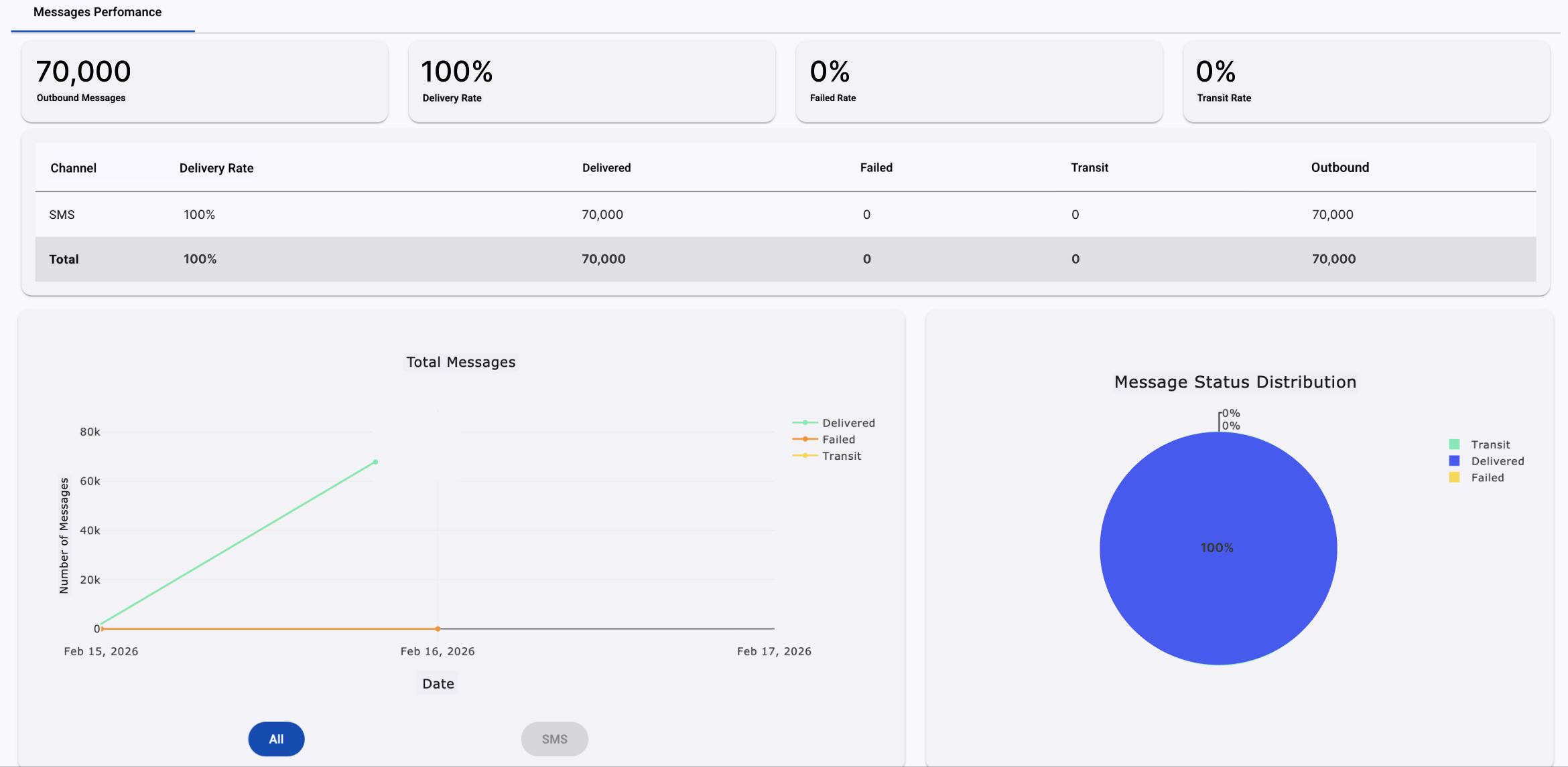 The Messages Performance tab provides a detailed visualization and analysis of message delivery outcomes across SMS. It helps you monitor performance metrics, identify delivery issues, and evaluate overall messaging effectiveness.