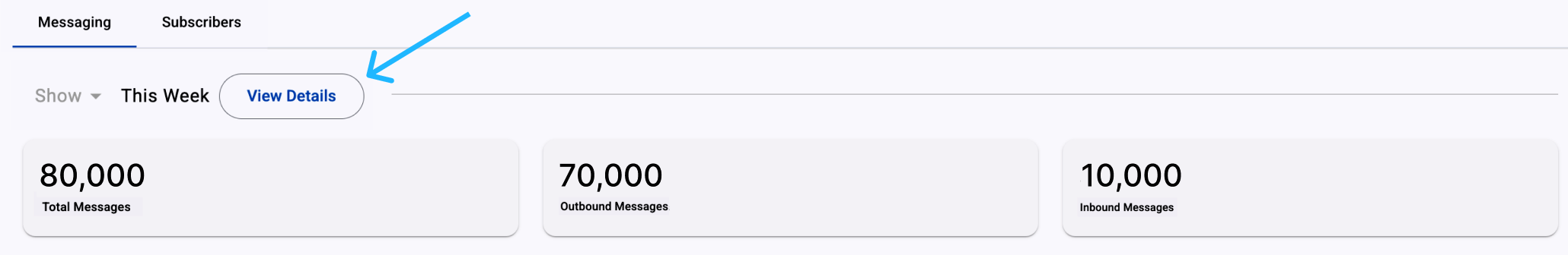 - Total Messages by Status Chart displays the number of outbound, delivered, in-transit, and failed SMS messages across the selected date range. The horizontal axis represents the selected time period, while the vertical axis reflects message volume per status.