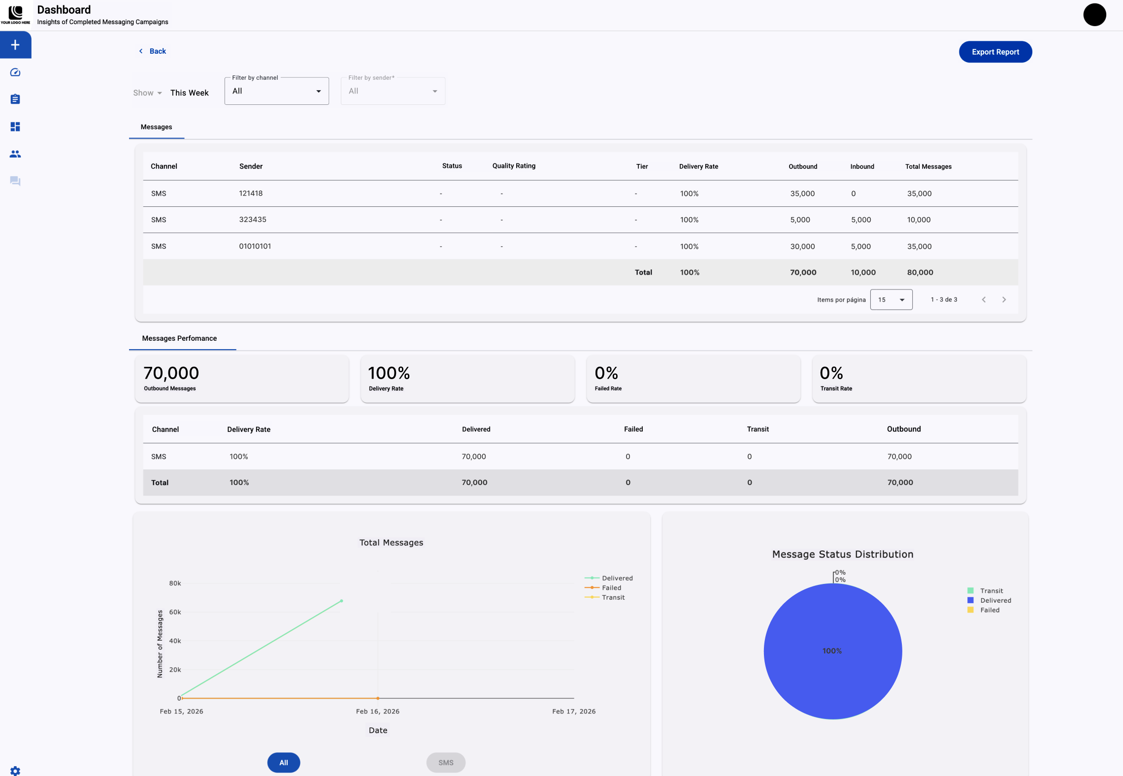 The Messages tab displays a table summarizing the number of messages sent (MT), received (MO), and delivery rates per sender. Aditionally, this table includes information on the success rate of delivered messages for each sender.