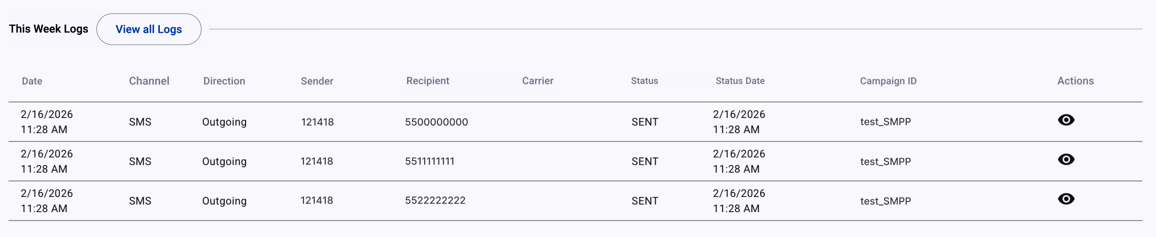 Together, the Messaging Logs and View All Logs sections provide complete traceability of SMS traffic submitted through the SMPP connection. These tools enable detailed inspection, filtering, and performance analysis of each message, ensuring full operational transparency and efficient troubleshooting.