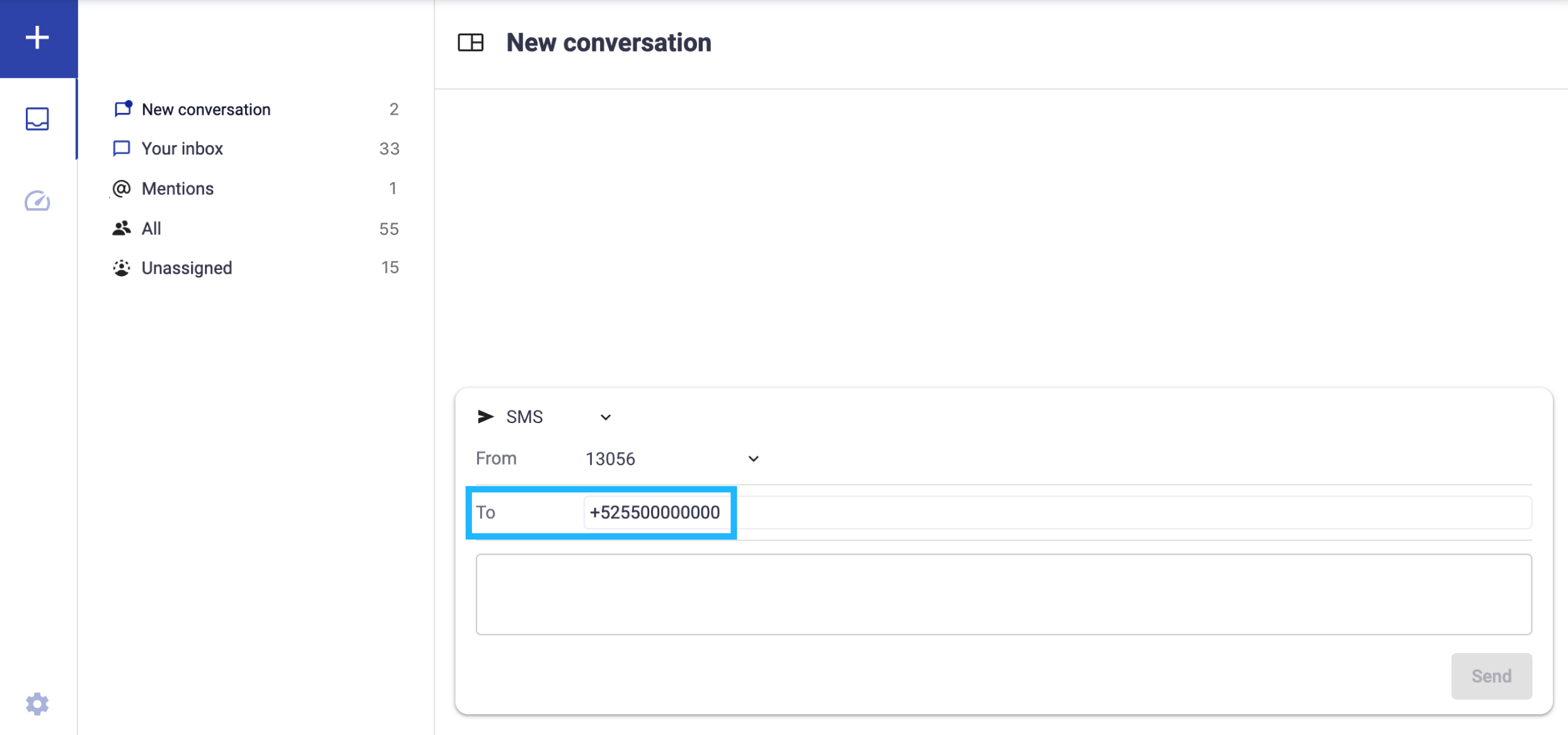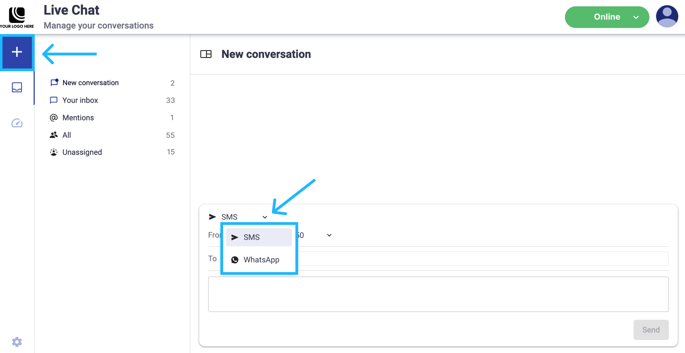 Click the New Conversation icon from the Navigation sidebar menu and select the channel you want to start a conversation on: SMS or WhatsApp.