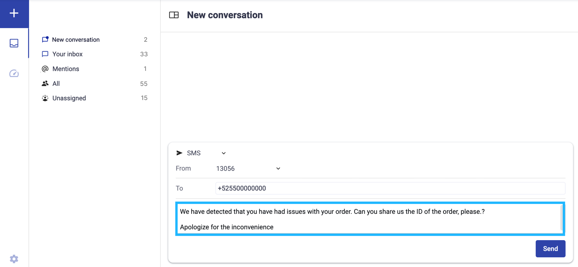 Let's start a new conversation with one contact in your workspace, without leaving the New Conversation section. This conversation can be managed just like any other. You can snooze it, leave internal notes, and export it.