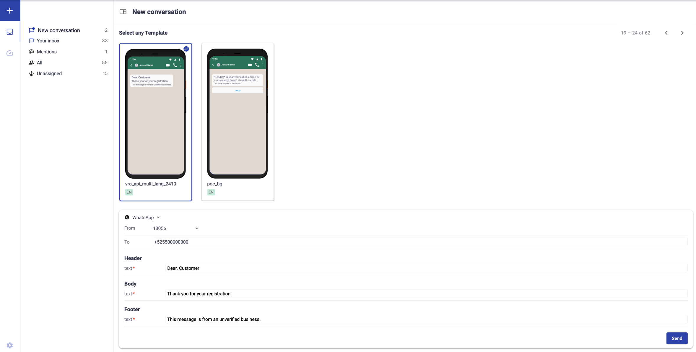 Send a new SMS message or WhatsApp template directly to existing users or leads.