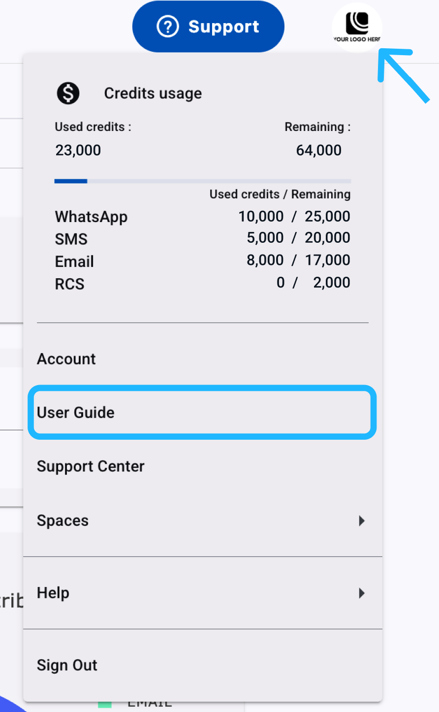 To access the user guide of the digital engagement platform, click on the avatar located in the top-right corner of the Navigation Bar, then select User Guide.