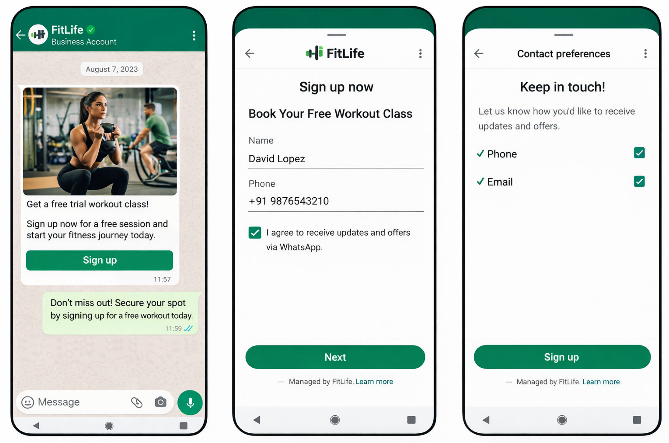 Businesses can use WhatsApp Flows for a wide range of use cases, including lead generation and customer growth. Flows allow companies to capture new leads and engage with existing customers through structured interactions, which is especially valuable during high-traffic periods such as promotional campaigns or peak shopping seasons. Common examples include simple registration processes for newsletters, events, product launches, or sales promotions, where users can submit their information in just a few guided steps.