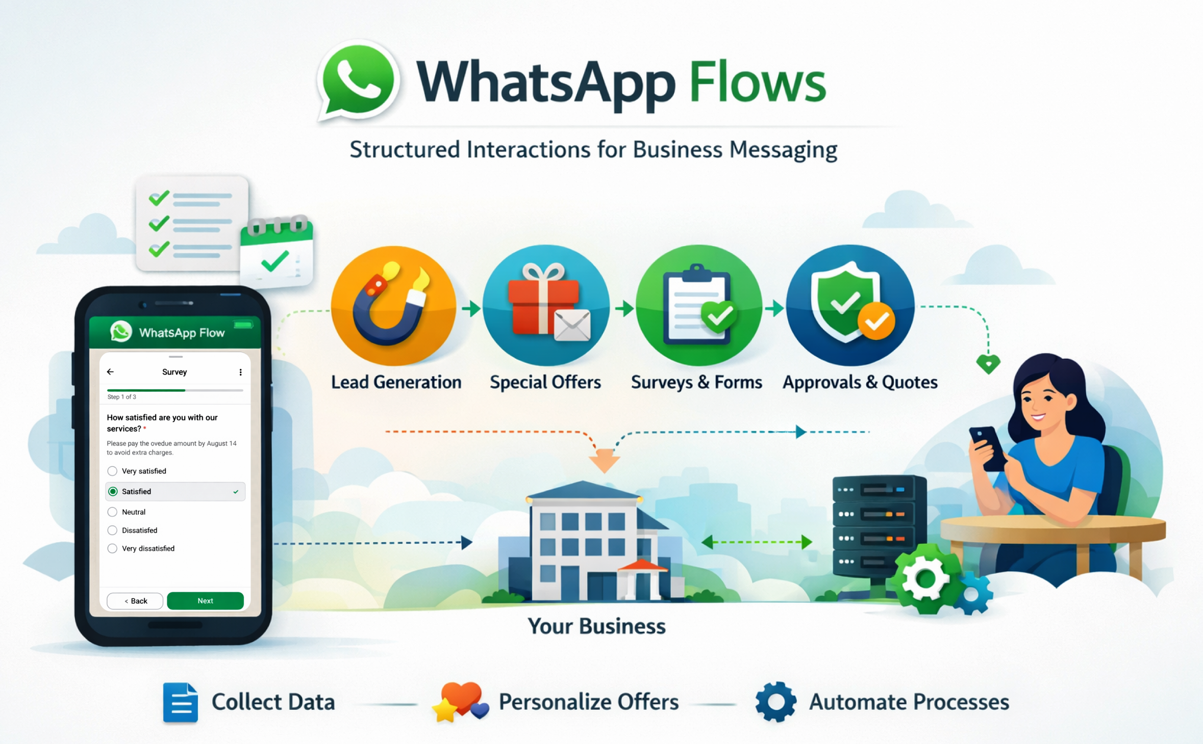 WhatsApp Flows provide a way to build structured and guided interactions for business messaging directly inside WhatsApp, without requiring users to be redirected to external websites or applications. With Flows, businesses can define, configure, and customize interactive experiences using native components such as forms, selectors, and action buttons, giving customers a more organized and intuitive way to communicate compared to traditional free-text conversations.