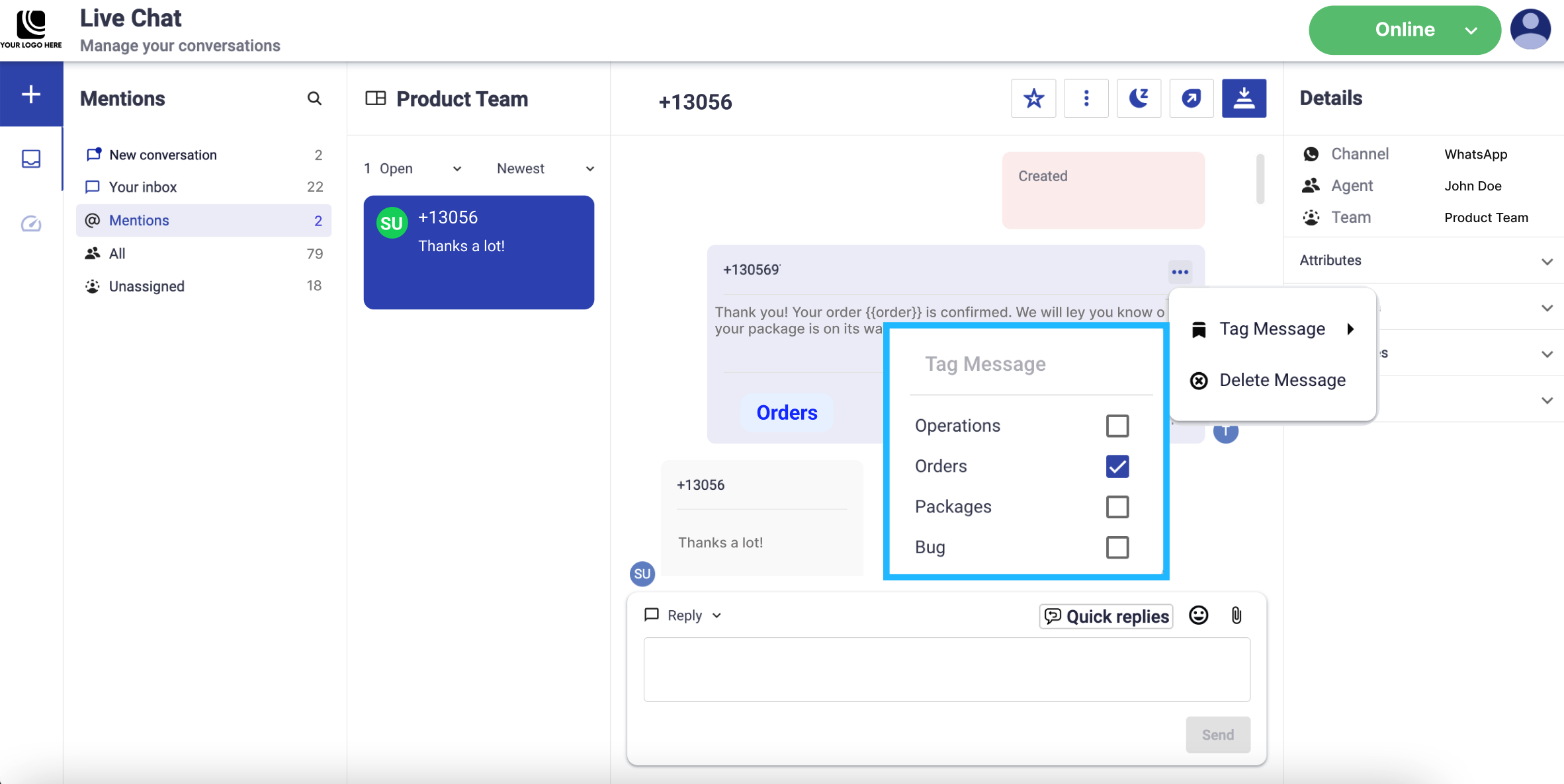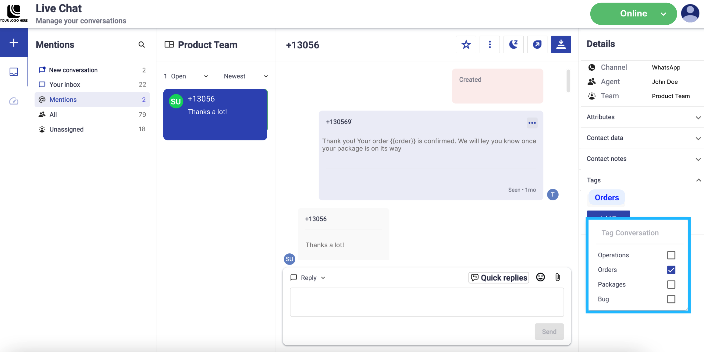 Another action you can take before you respond is tagging a conversation. It is a great way to identify trends and topics in the conversations that your agent or team receives. That is, a good support team goes beyond simply resolving individual customer issues. They proactively leverage the power of conversation tagging to uncover trends, prevalent topics, and emerging patterns within customer interactions. Over time, this meticulous tagging process accumulates a rich repository of valuable insights, readily accessible for future analysis and strategic decision-making. Enabling them to address customer needs proactively and effectively.