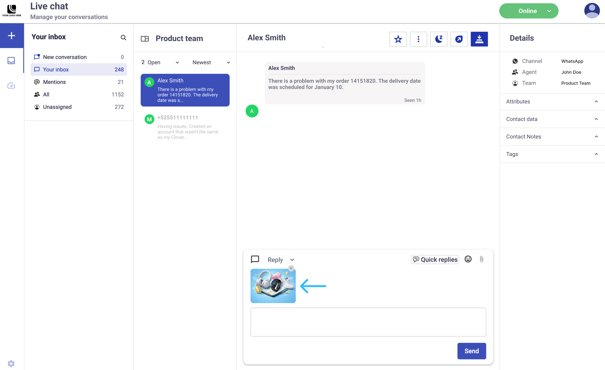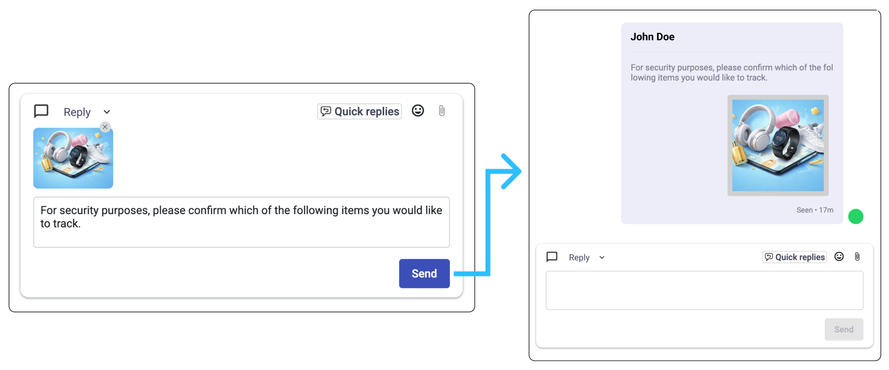 Add text alongside the image to provide context or instructions. Once the message is sent, the image is delivered as an attachment through the corresponding channel and appears in the conversation view together with any included text.