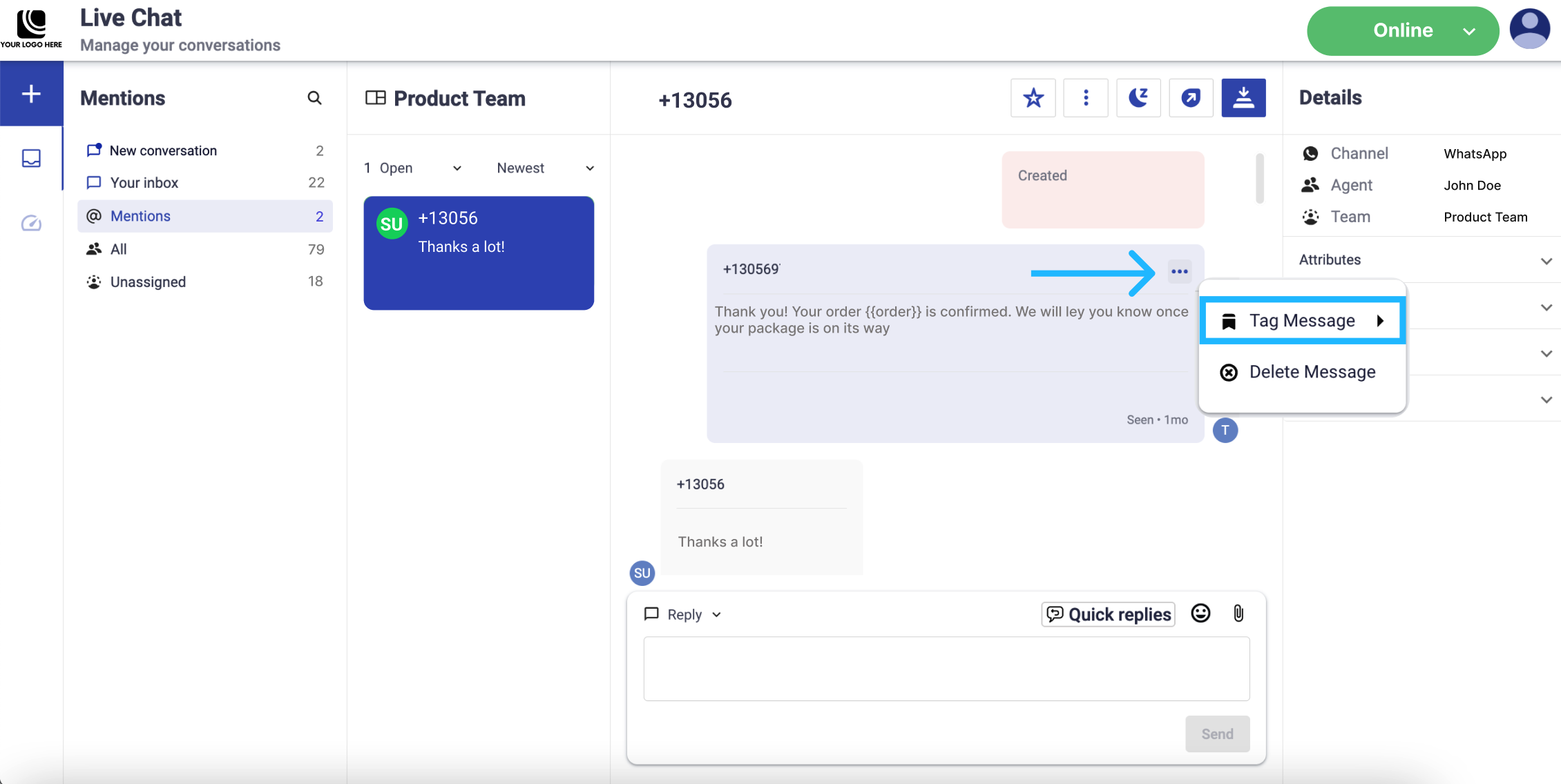 Quick replies: List predefined response messages for SMS and WhatsApp that agents can use to reply faster to common user questions during live chat interactions. They help ensure consistent messaging, save time, and improve response efficiency.